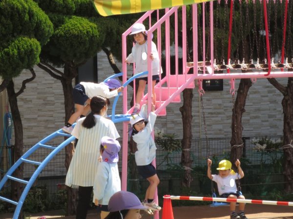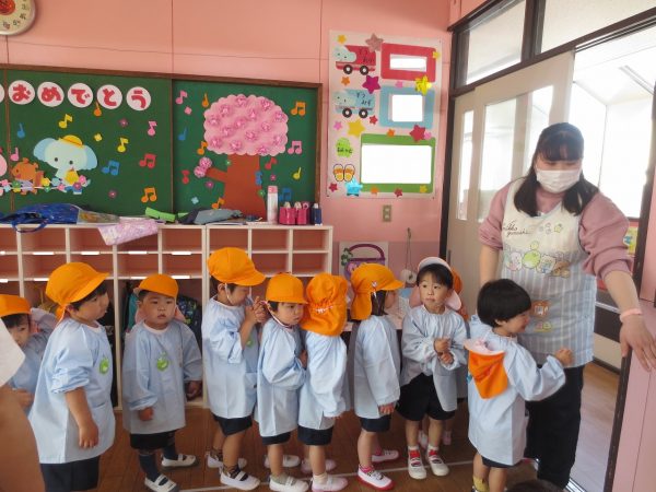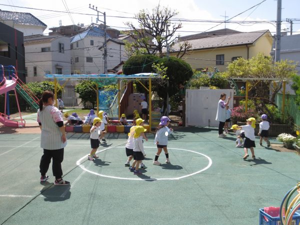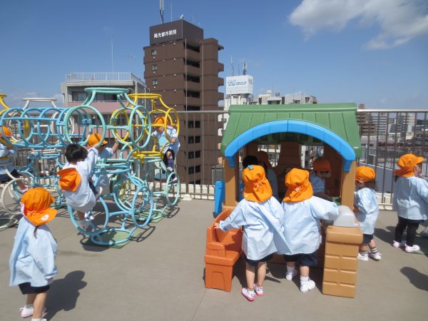 小桜組さんもお集まりしたよ。菊組さんが小桜組さんのお部屋に来て「朝の歌」を歌ってくれました。小桜組さんは園内探検をして屋上で遊んで気持ちよかったね(^^♪