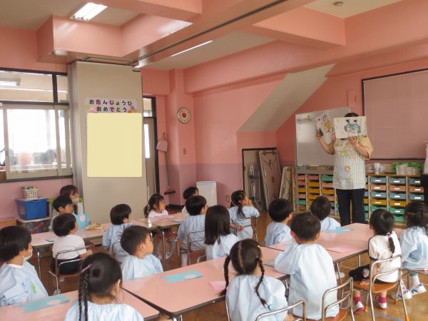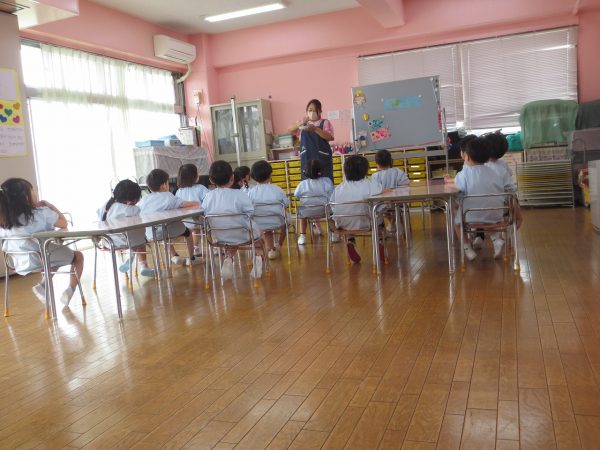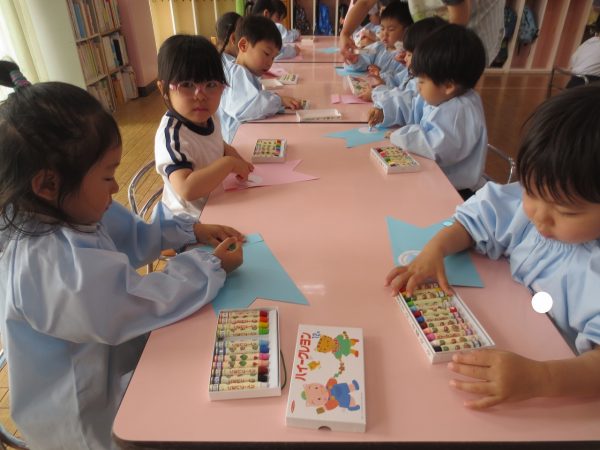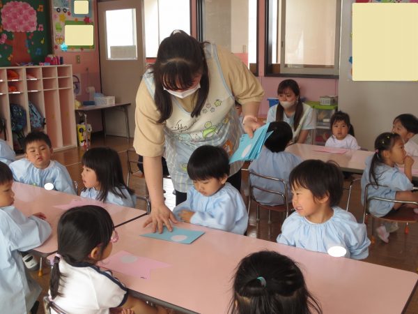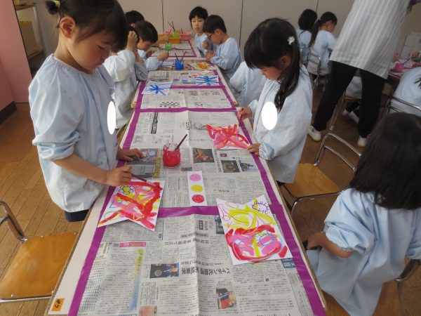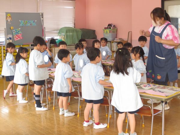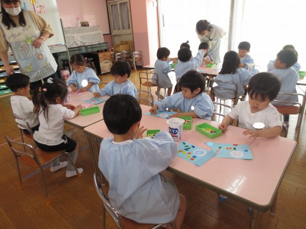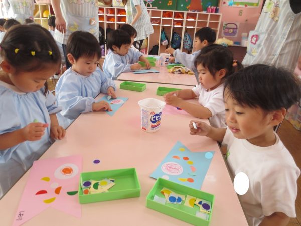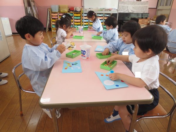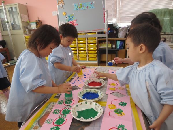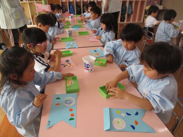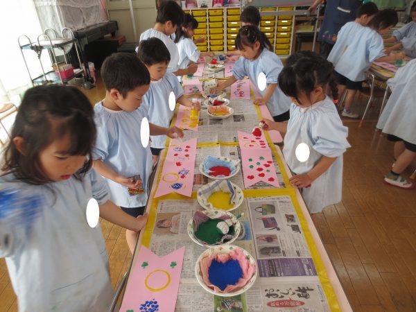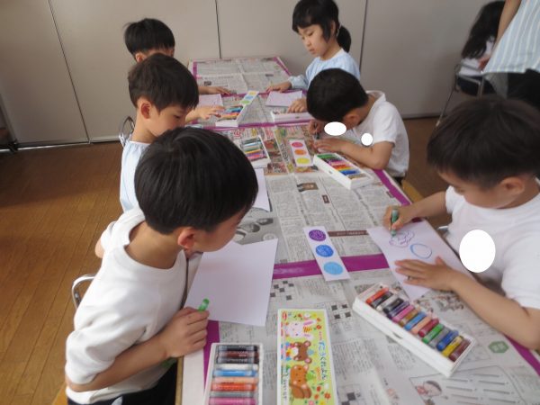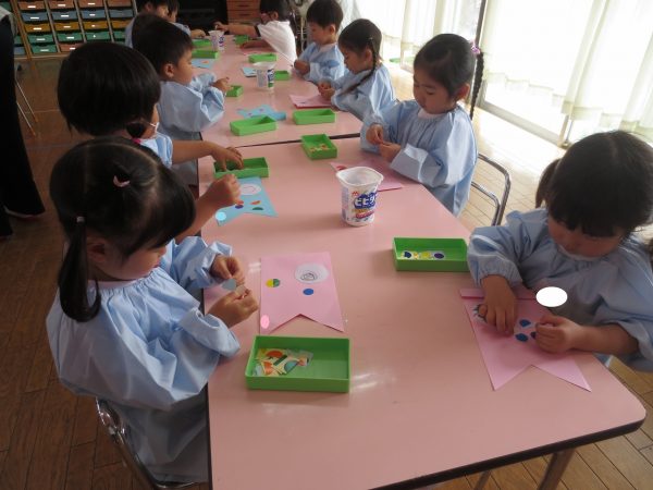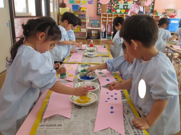 クラスでは全学年で鯉のぼり製作をしました。小桜(年少)組さんは一人1つ。菊(年中)組さんは一人2つ。藤(年長)組さんは一人1つ作った後、クラスのみんなで大きな鯉のぼりを作ります。