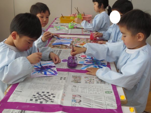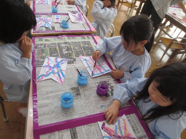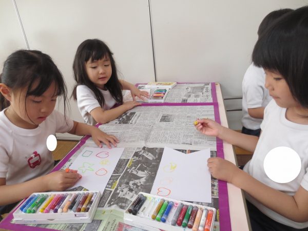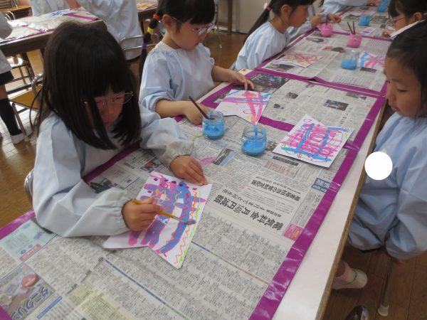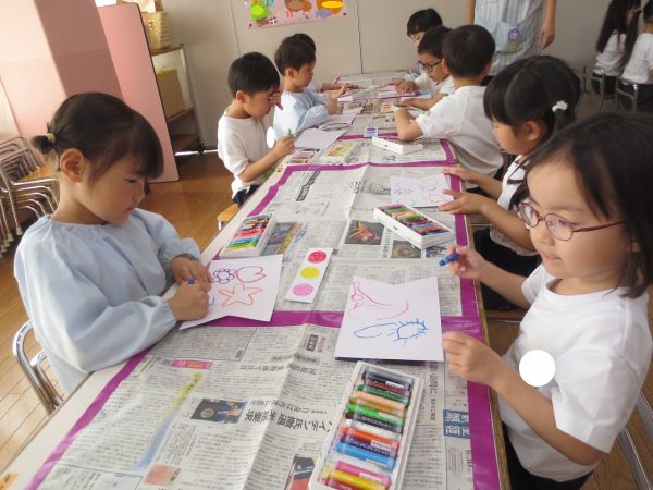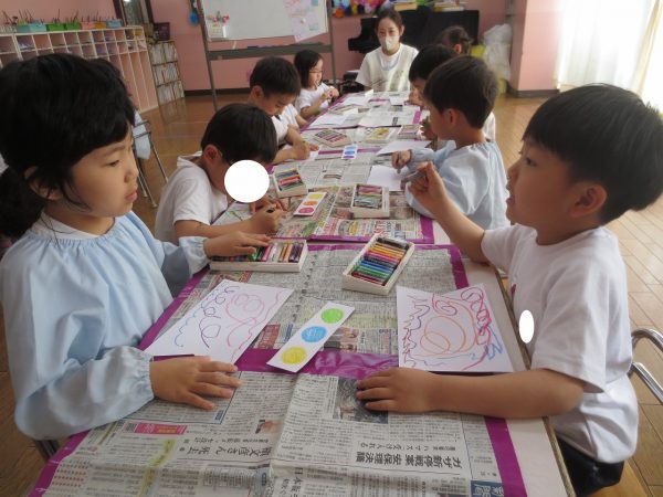 藤組さんは、クレヨンで模様を描いた後、絵の具で模様を描いてはじき絵をしました。