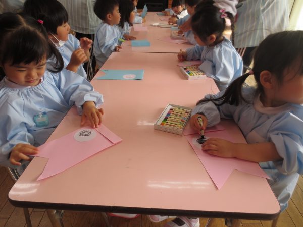 小桜組さんの鯉のぼりは目をクレヨンで描いてから、シール貼りをしました。21日は屋上で鯉のぼりさんと一緒に走ろうね💕
