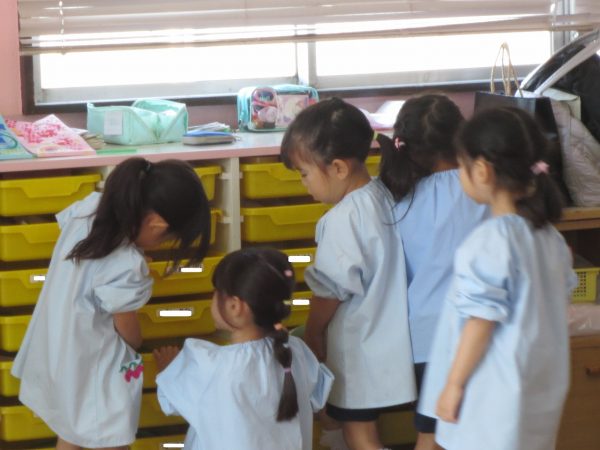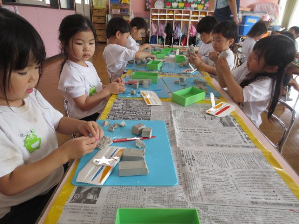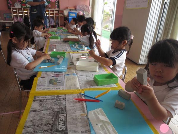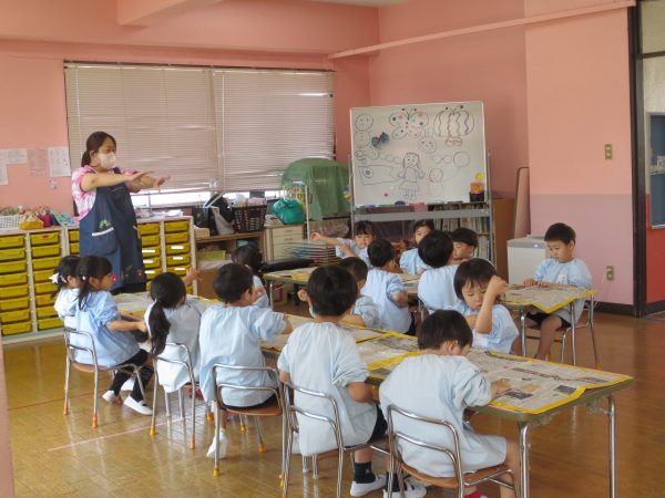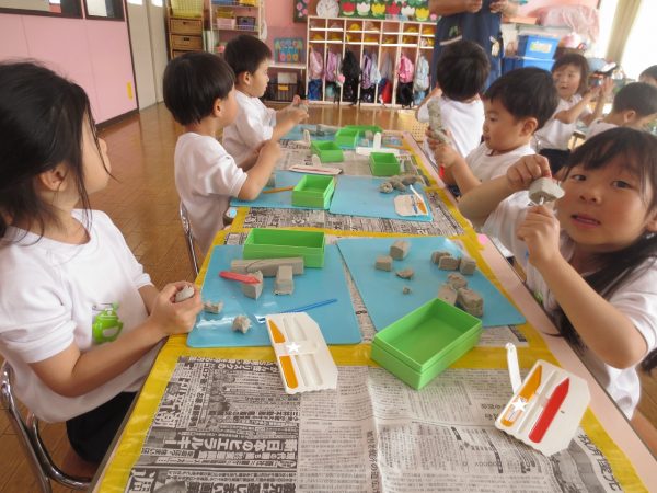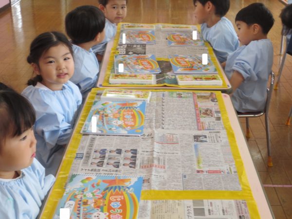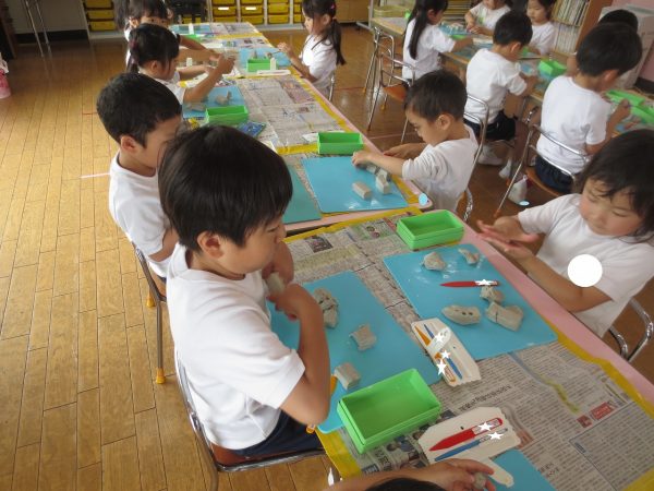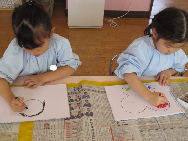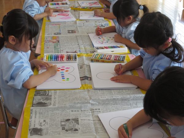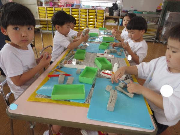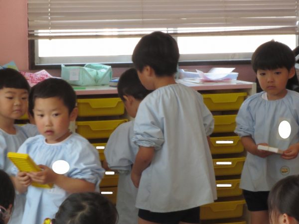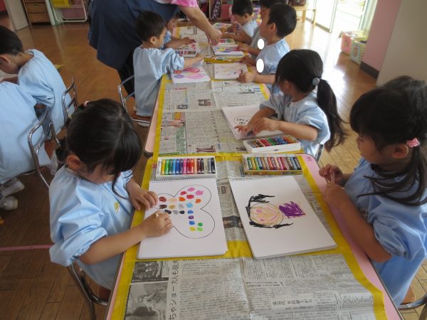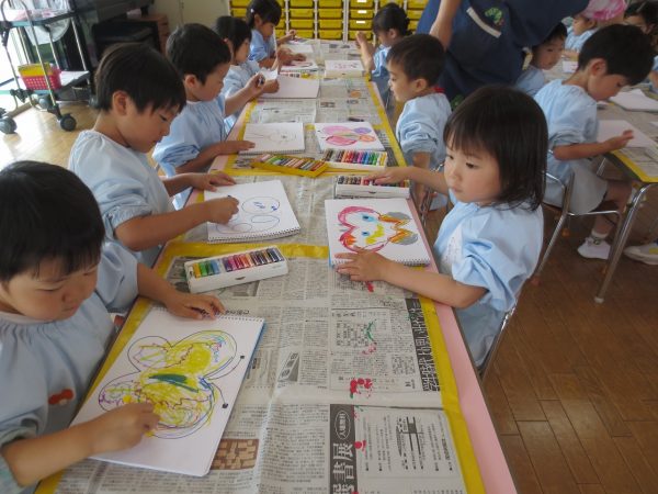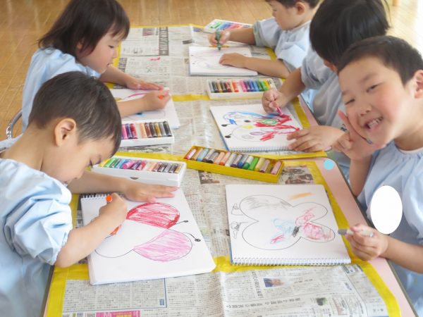 菊組さんがクレヨンでチョウチョの模様を思い思いにぬったり、〇から何を描くか決めて描いたり、クレヨン画を楽しみました(^^♪~ 始める前にお袖をめくって クレヨンを順番にとりに行って 自由画帳がみんなの前にいくまで待って さぁ描くよ 新しい粘土や粘土ベラを使って遊びました💕