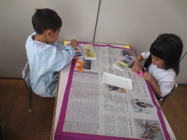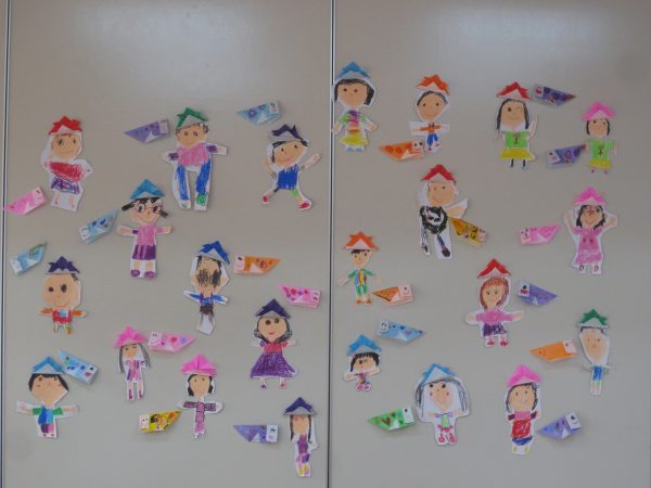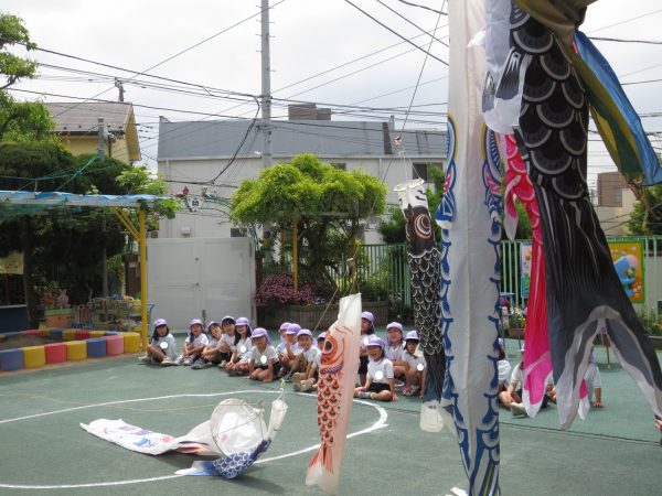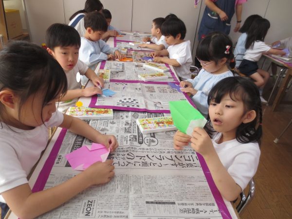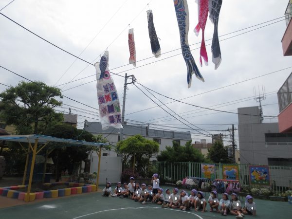 自分の好きな色の折り紙で鯉のぼりを折りました。兜も折って、自分も描いて、次は何をするのかな?