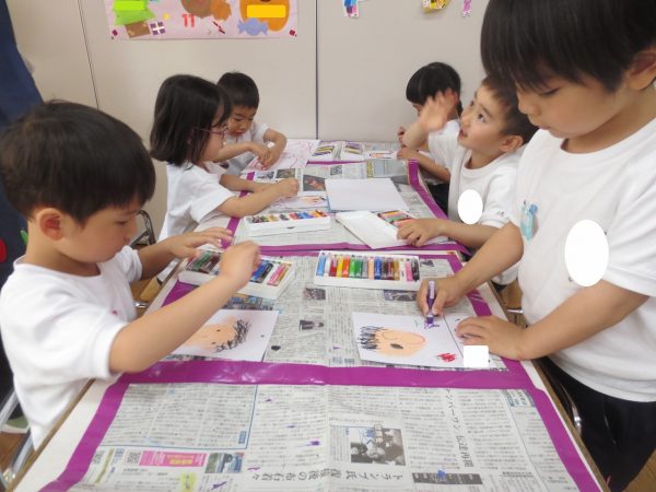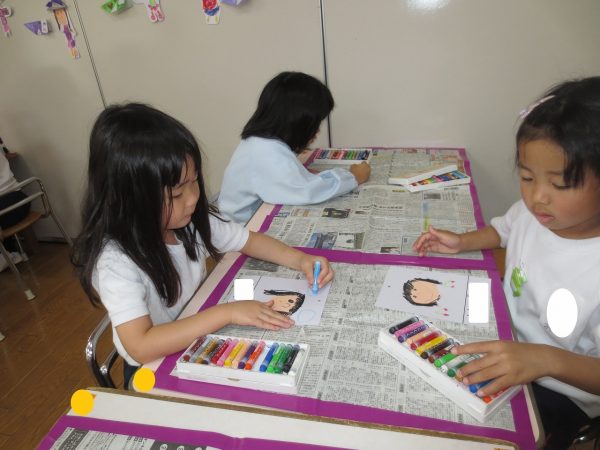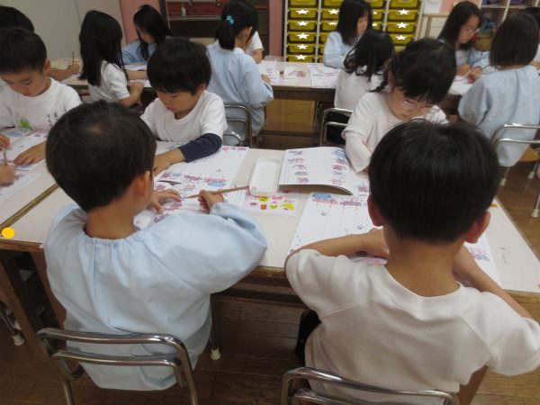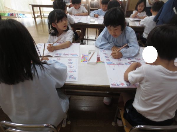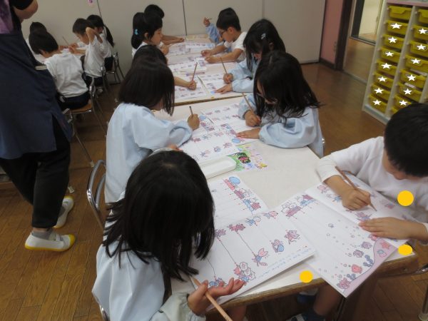 藤組さんだけがやるひらがなわーくがあります。初めてひらがなわーくをやりました。姿勢・鉛筆の持ち方に気をつけながら、線をひいたりしました。 藤組さんだけのお当番があります。朝や帰りのご挨拶をしたり、いろいろな配りものをしたりします。早く順番が来ないかな~ お当番表を描いたよ。