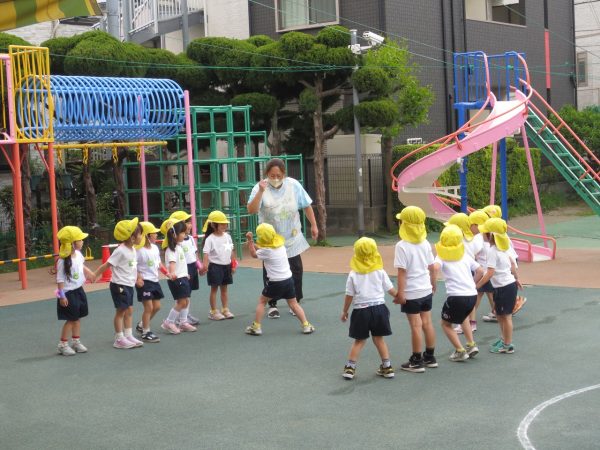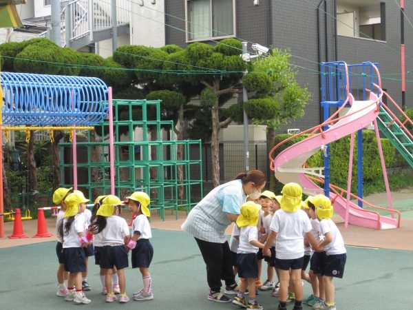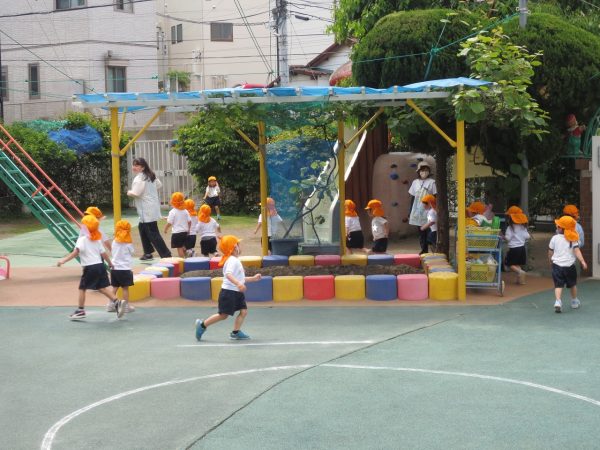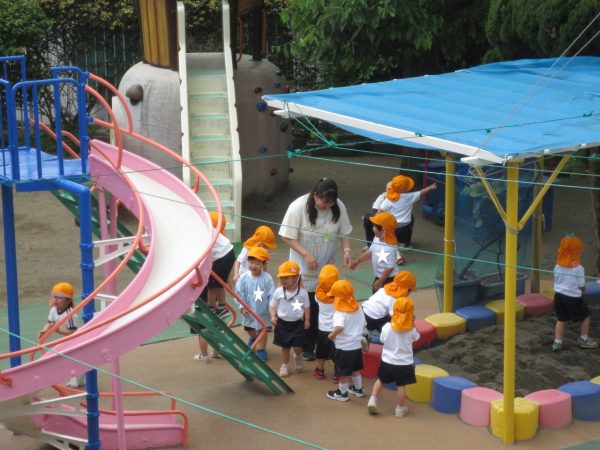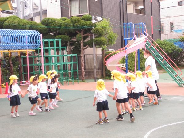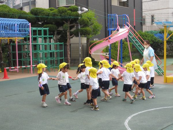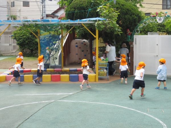 暑すぎず気持ちよいお天気になりました。風薫5月にピッタリ。こんな日はお外遊びが一番です。小桜組さん、菊組さん、各々の時間にたっぷりとお外遊びを楽しみました。藤組さんは大谷公園へお出かけしました。 小桜組さんは「マテマテ鬼ごっこ」で先生を追いかけました。 菊組さんは「花いちもんめ」をしました。