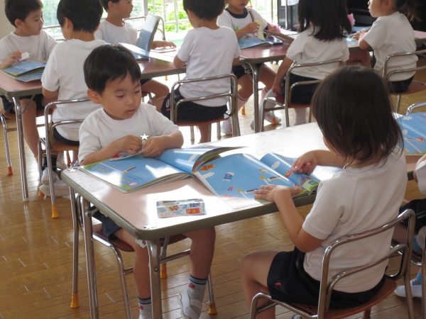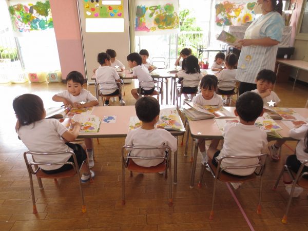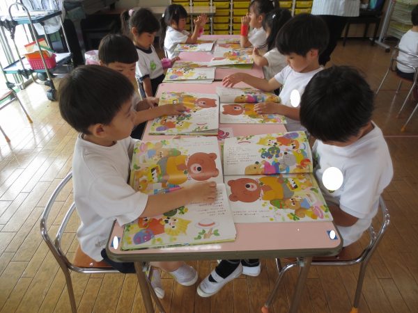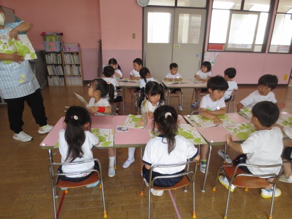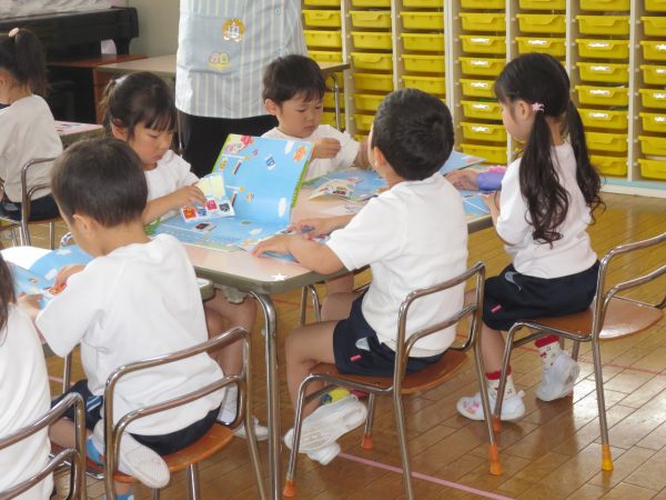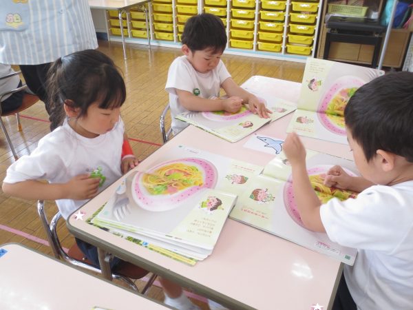 購読絵本には物語や美味しそうな食べ物の写真、シールを貼るページがあります。 ページいっぱいの春キャベツはちぎり方の指の写真が、トーストにはジャムの写真がついていたり、5月のシール貼りは色とりどりの鯉のぼりをページいっぱいに泳がせました。春キャベツとベーコンのスパゲティーは美味しそう。お家でも作ってみてください。