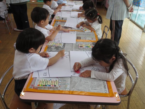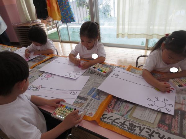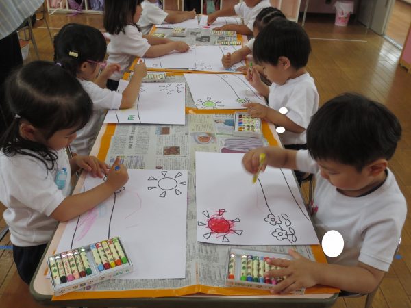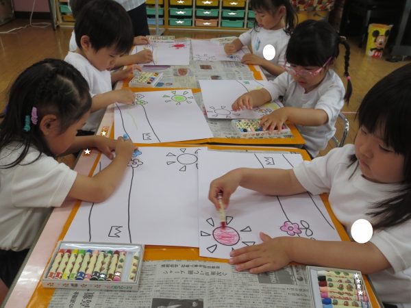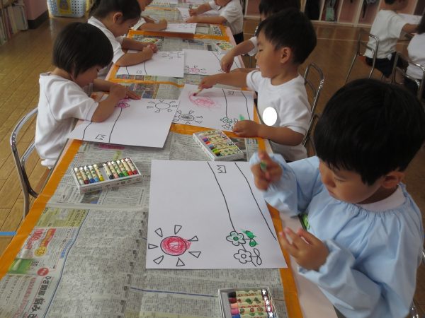 <小桜組> 朝の歌をうたったり、写真を使ってお名前呼びをしたり、折り紙のバスと山を貼る画用紙にぬり絵をしました。画用紙いっぱいにぬれたね。