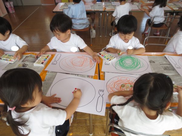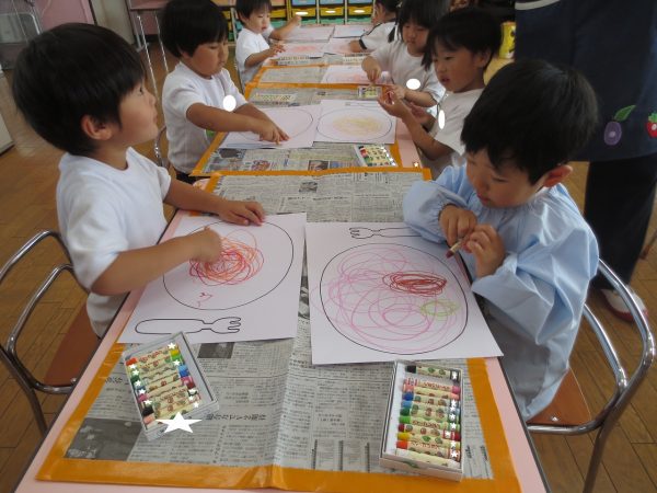<クレヨン画> クレヨンでスパゲティーを描きました。赤いのはトマト。ピンクのはたらこ。虹色もあるよ。美味しそうだね💕