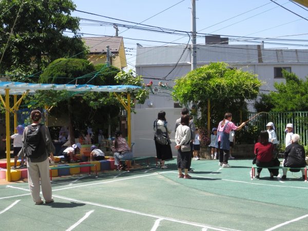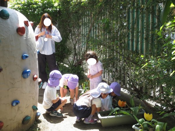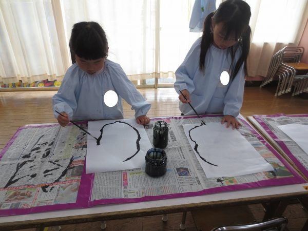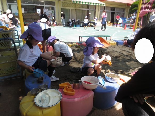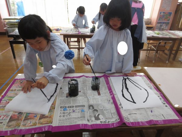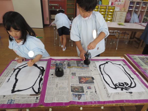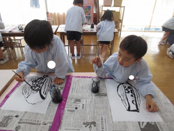 ジャガイモとトウモロコシを植えた藤組さん。毎日お当番さんが水やりをしてくれます。少しずつ背も伸びてきたよ。早く大きくなって、美味しくな~れ💕 墨を使って野菜を描いたよ。一足先にトウモロコシも描いたんだ。 <墨絵> <外遊び自由遊び参観> 来てくれてありがとう💕楽しかったよ。