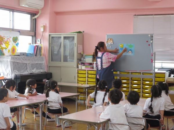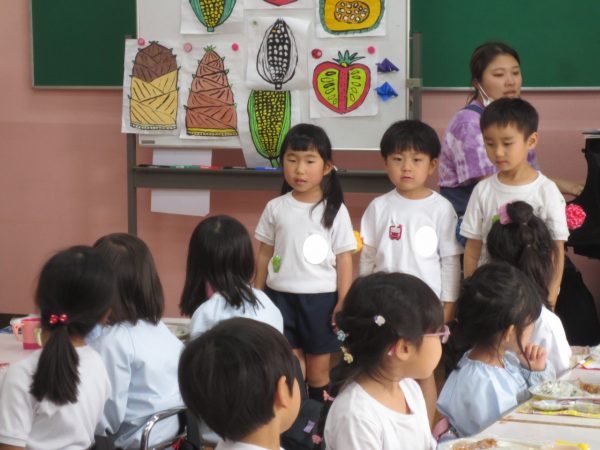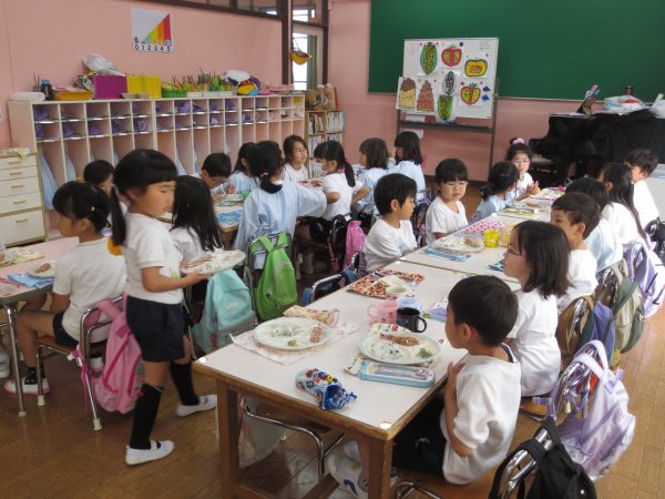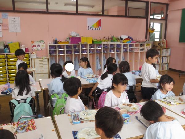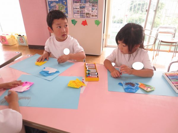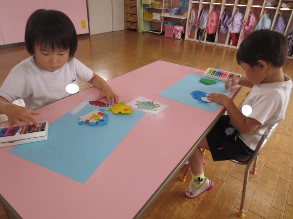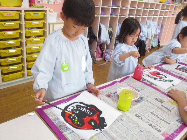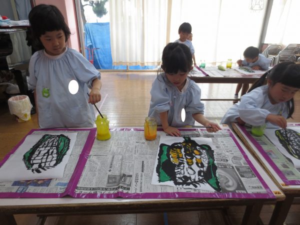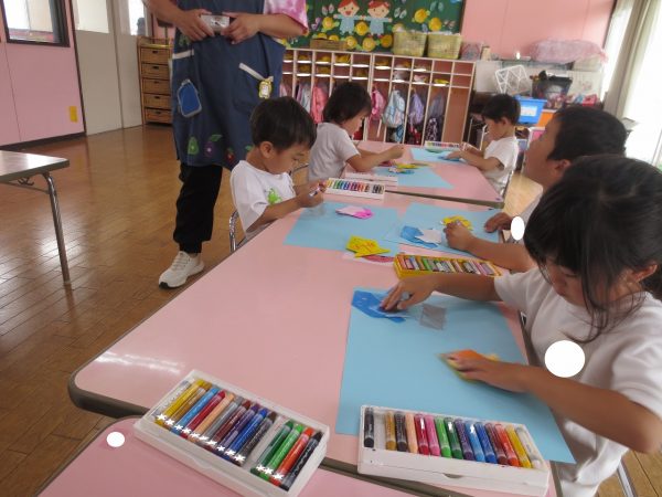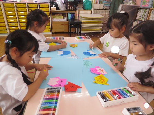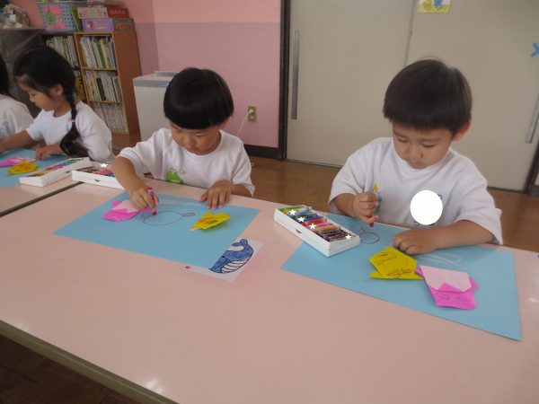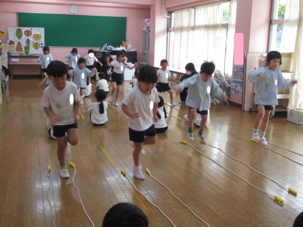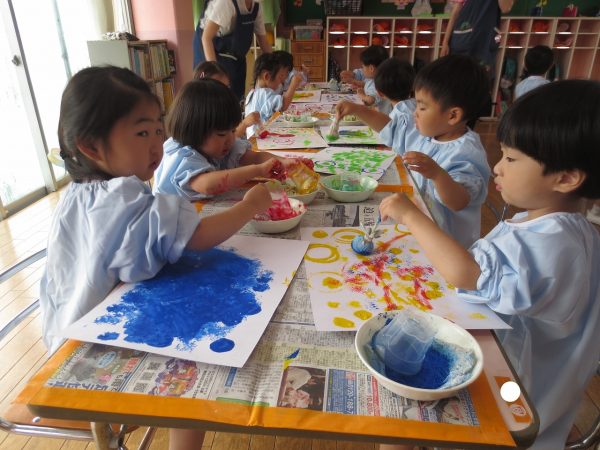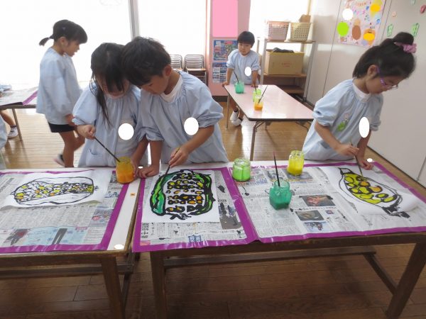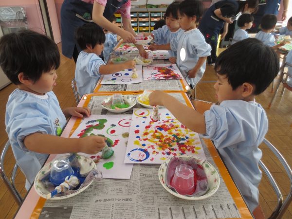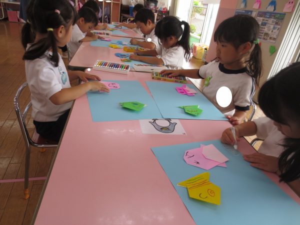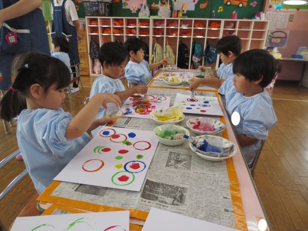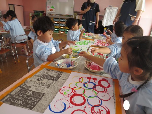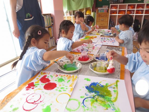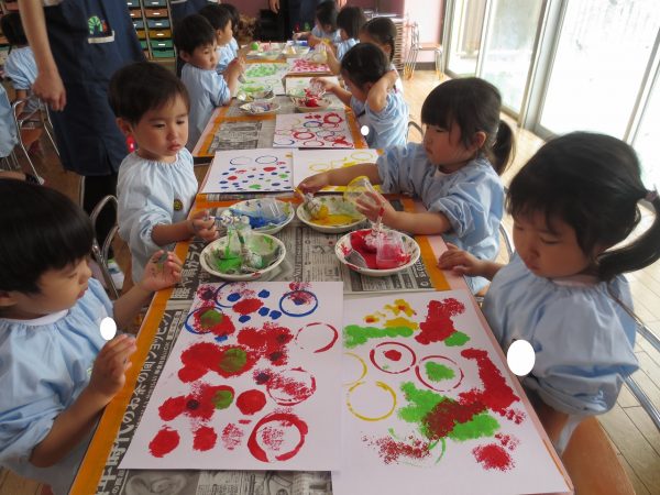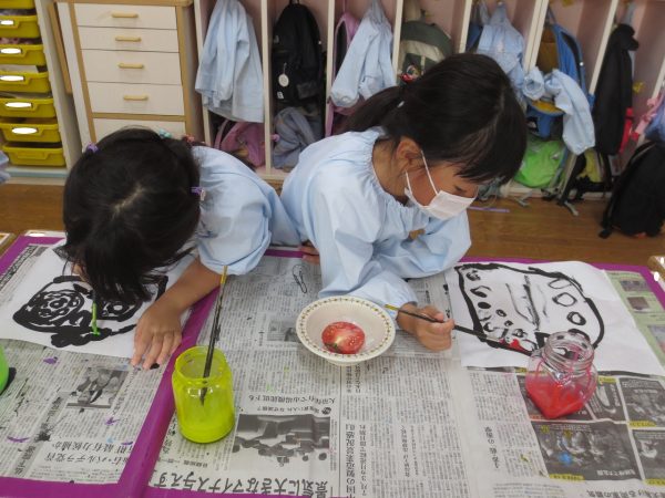 <菊組>もうすぐ水族館に親子遠足。折り紙で折ったペンギンさんやお魚さんのお友達や氷のお家を描いたよ。 <小桜組>絵の具でスタンプをしたよ。赤・黄緑・青・黄色の〇◎きれいでしょ。 <藤組>墨絵に色をぬったよ。美味しそうで墨ってカッコいいね。 お当番さんは給食の配膳もするんだよ。 縄跳び体操の技も1つ覚えたよ。