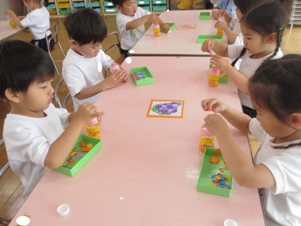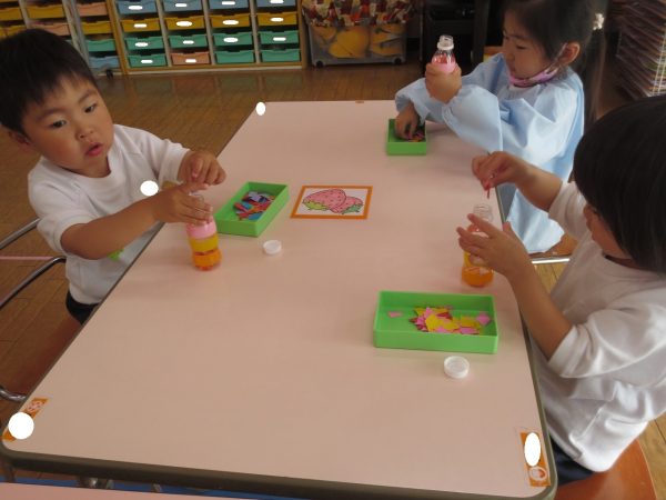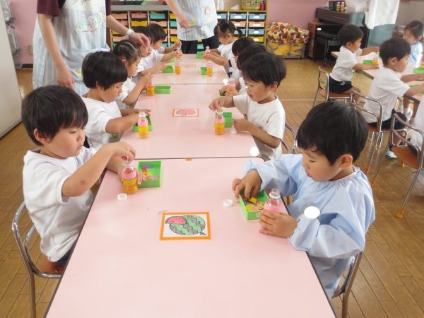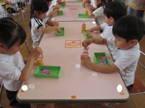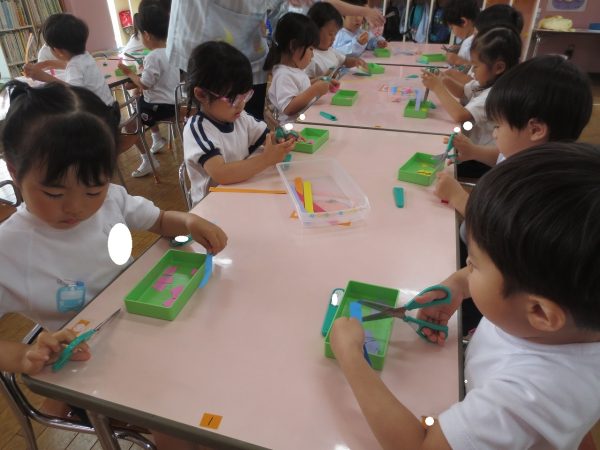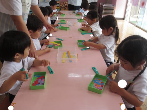 切り方を身につけていくため順番にゆっくりと行いました。①ハサミの持ち方 ②グーパとと指を広げたり閉じたりする練習をして ③パーをしてハサミを開き、紙をハサミの間にはさんで、グーにして紙を切る 作業を繰り返しました。2本、3本、切りたいお子さんは4本、5本と切ってRー1の容器にいれてジュースを作りました。美味しそうなジュースができたね💕