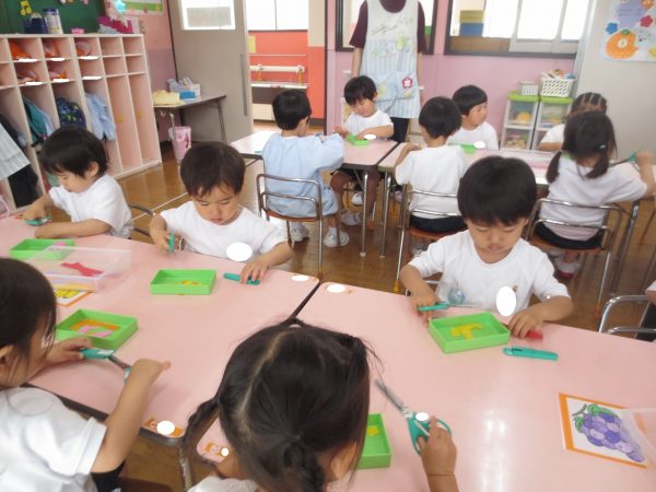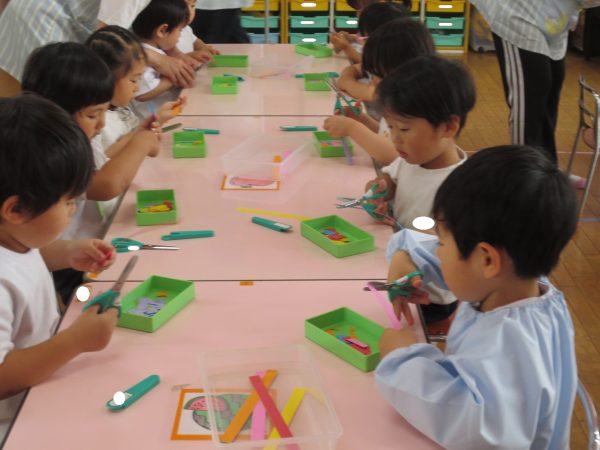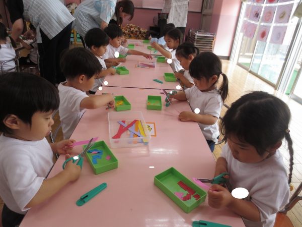 小桜組さんが初めてハサミをもって、チョキチョキと細長い色画用紙を切りました。