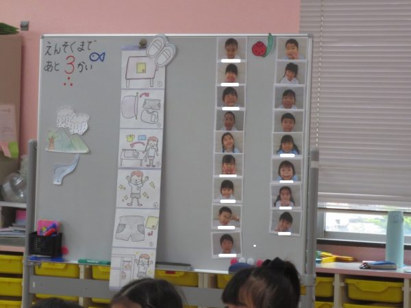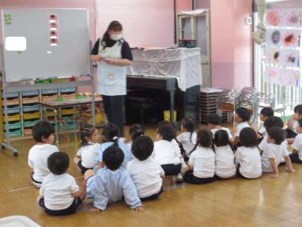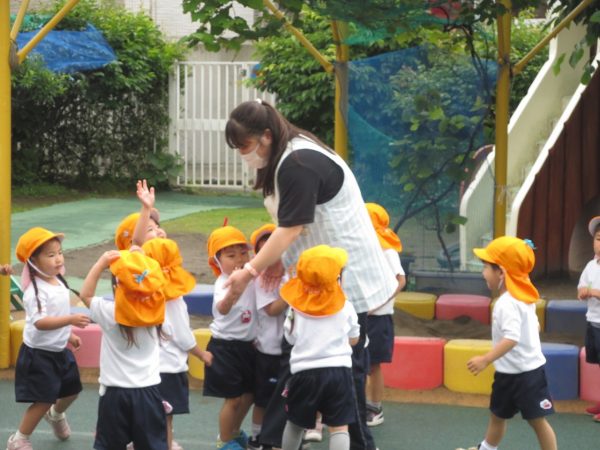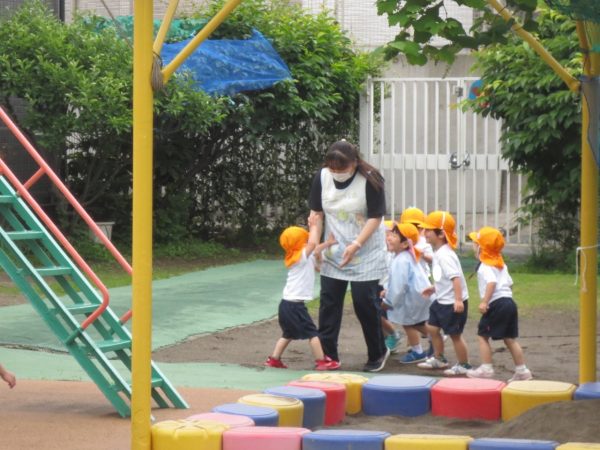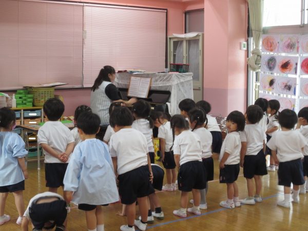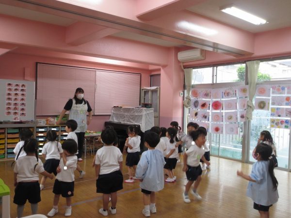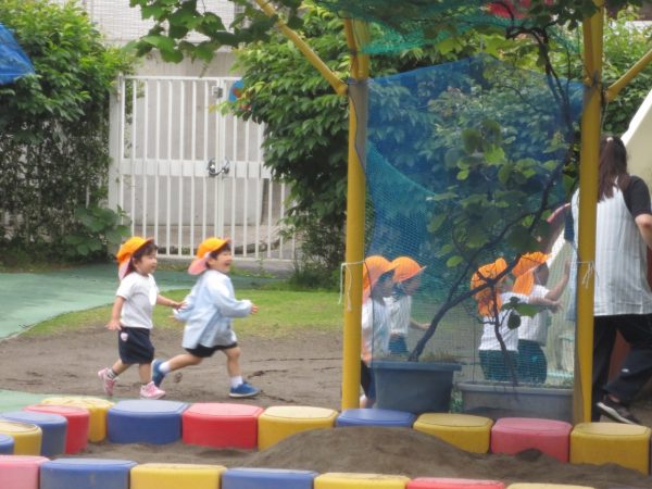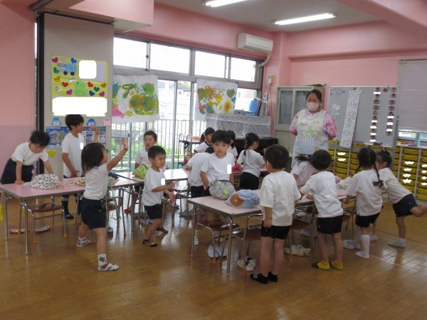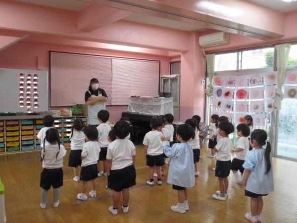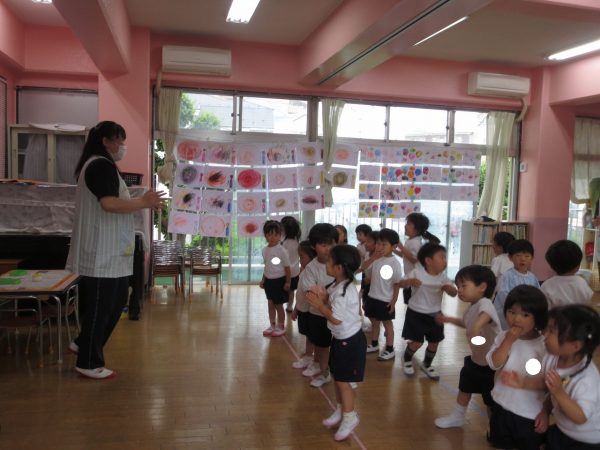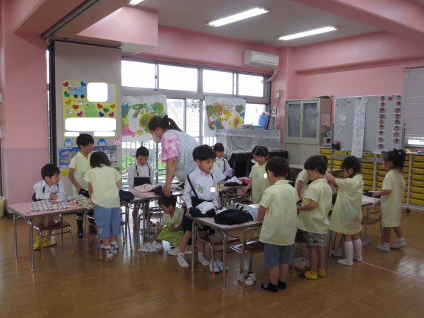<菊組> 久しぶりのお着替え。新しい菊組さんも一緒にみんなでお着替えをしました。順番があるんだよね。絵表示をみながら少しずつお着替えをして、思い出したり、覚えたりしたよ。 <小桜組> お集まりで朝の歌は上手になったね。写真をみながらお名前呼びをしたり、サンサン体操を踊ったよ。今度は藤組さん・菊組さんと一緒に朝礼をしようね。お外遊びは鬼ごっこして、先生をつかまえたよ。