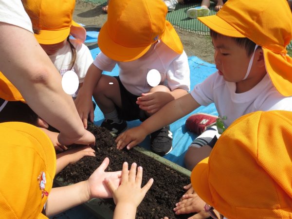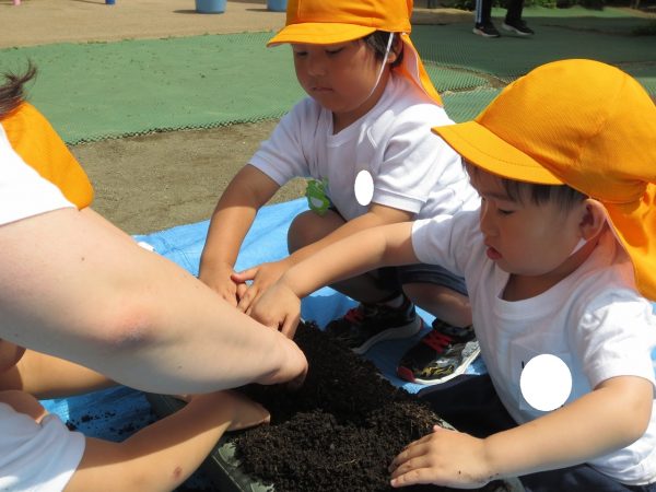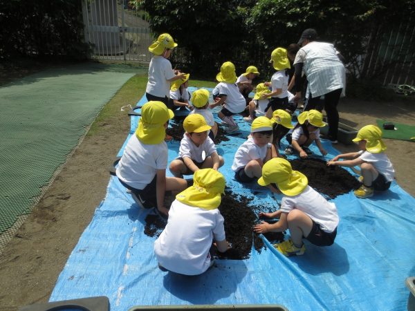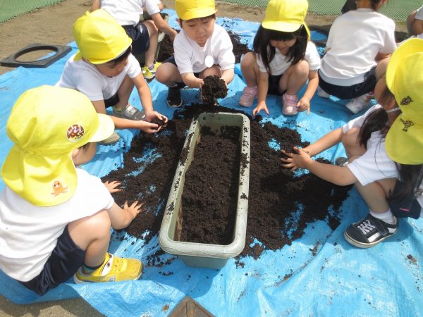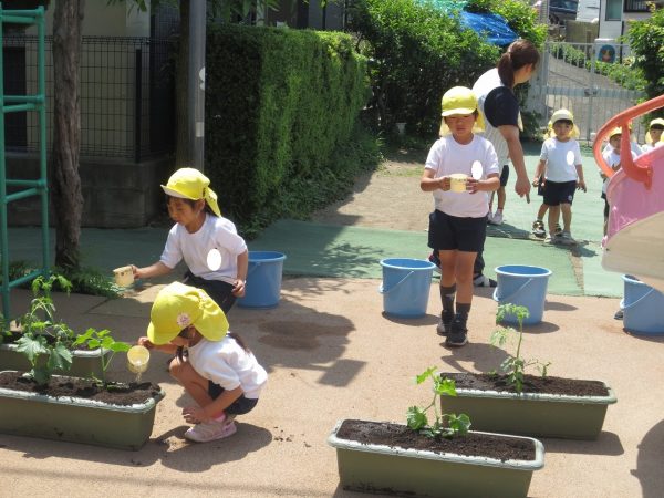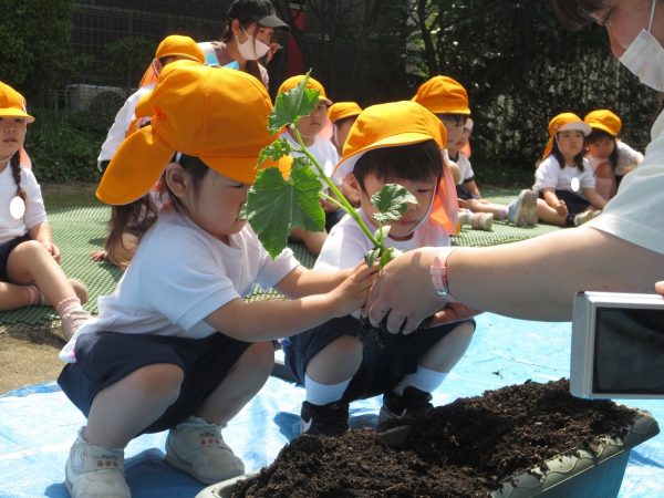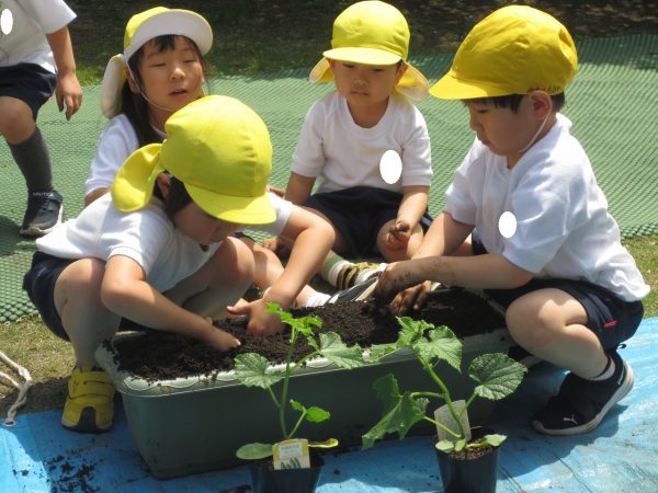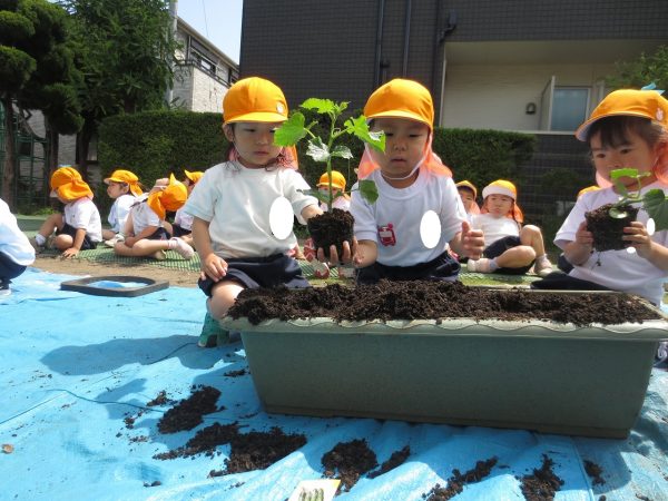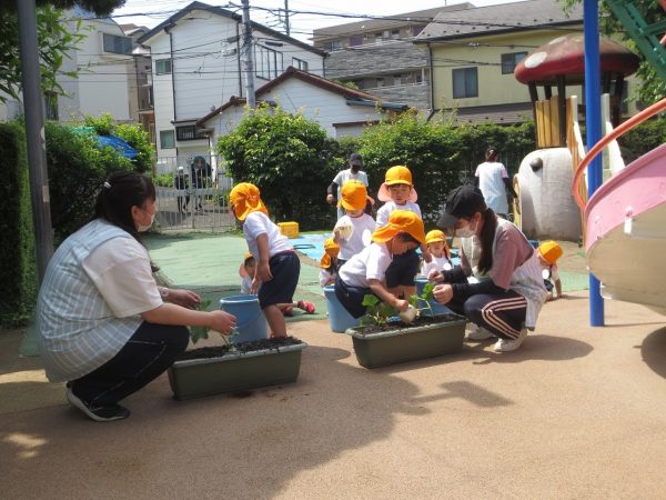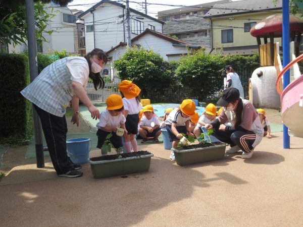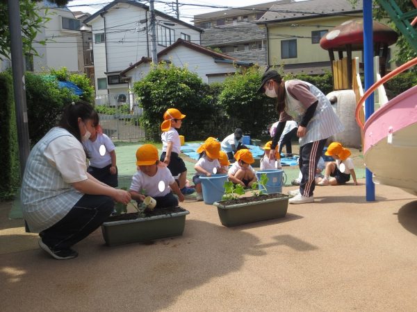 五月晴れの中、菊組さん・小桜組さんもプランターで野菜を栽培しました。