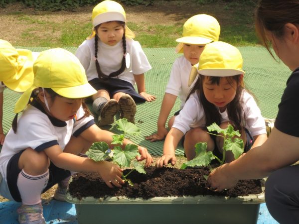 <小桜組> きゅうりを植えたよ。プランターの土に穴をあけて、苗を入れて、土をかぶせて、お水をあげました。美味しいきゅうりができますように💕
