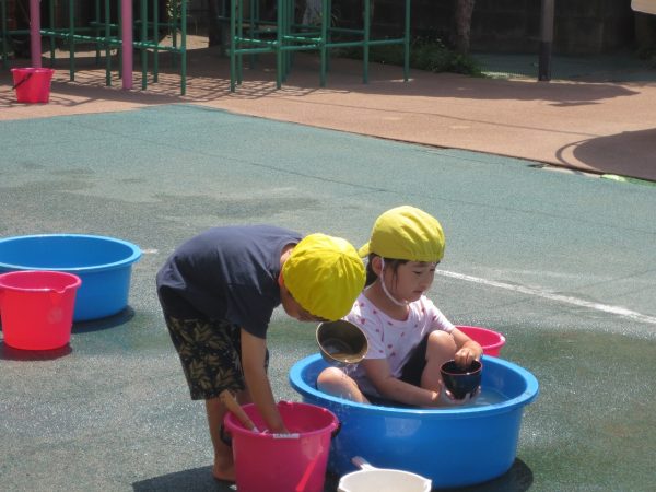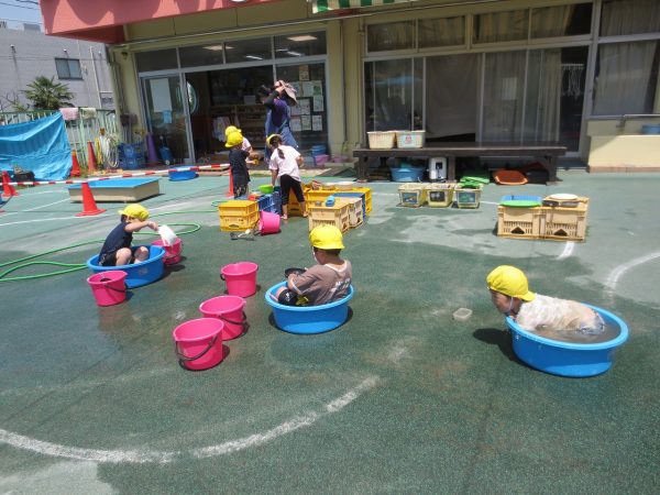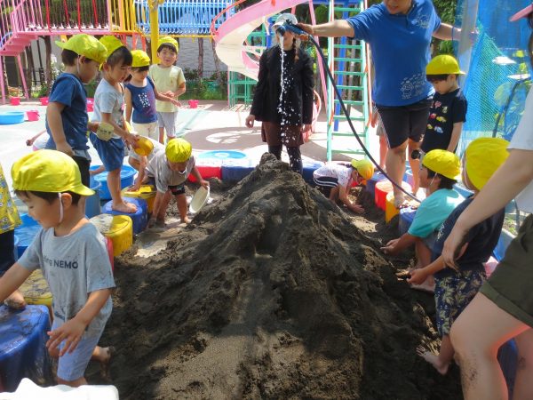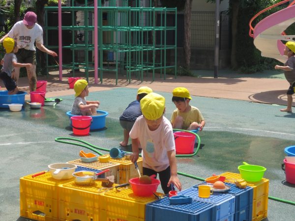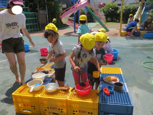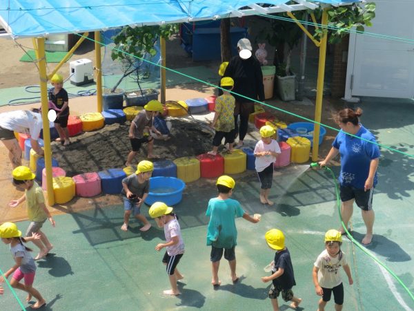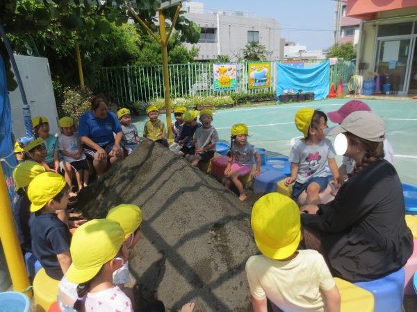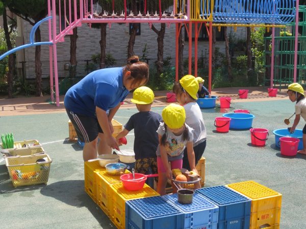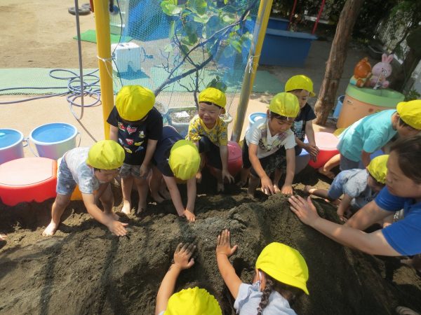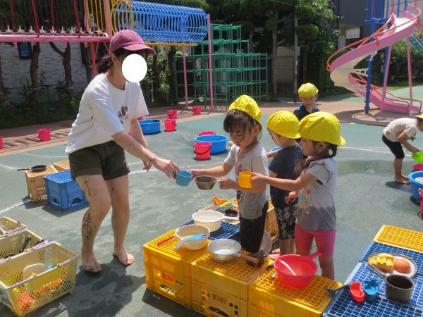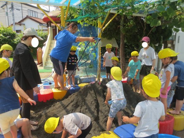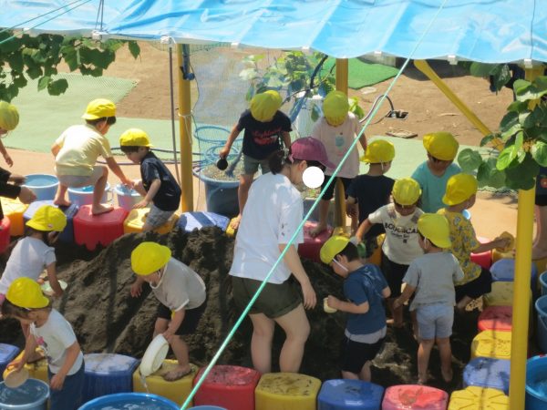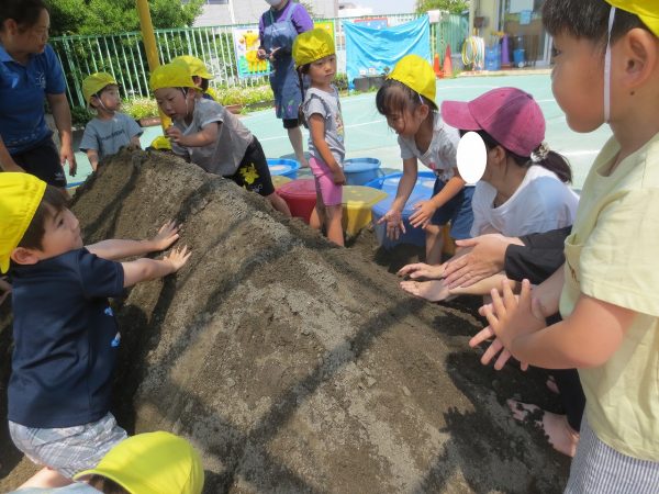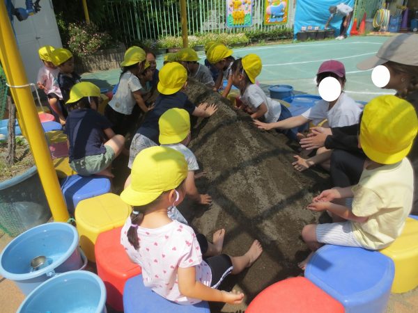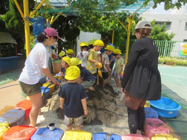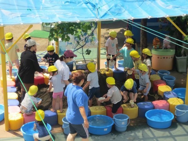 泥んこ遊び日和になりました。今日は保育参加です。保育参加は参観と違って、保護者の皆様方に子ども達と一緒に遊びながら、先生のお手伝いをしながら、幼稚園での集団遊びを体感していただく時間です。「楽しかったです!」の保護者の皆様方の言葉は毎回とても嬉しく聞かせていただいています。お手伝い、ありがとうございました。