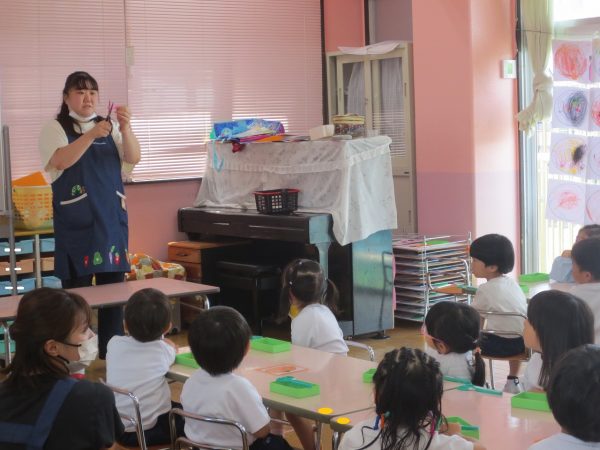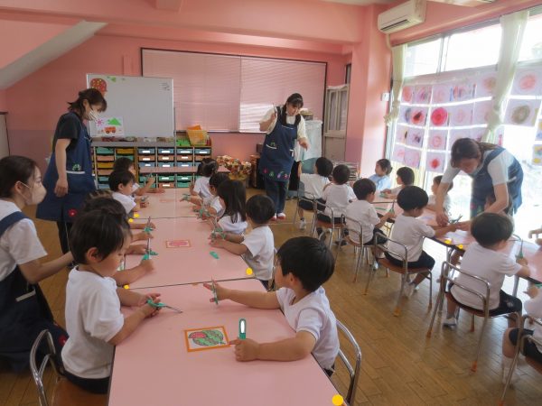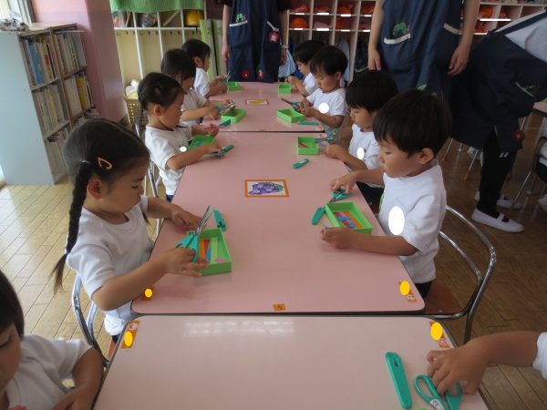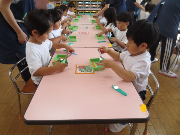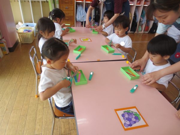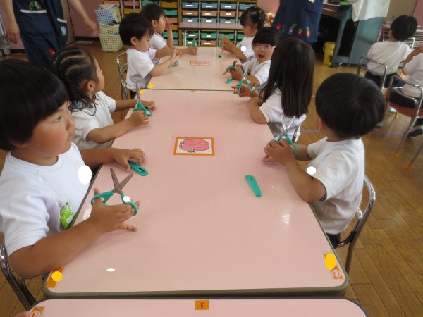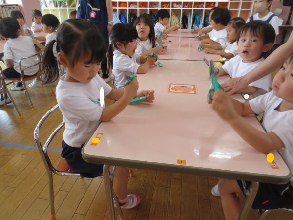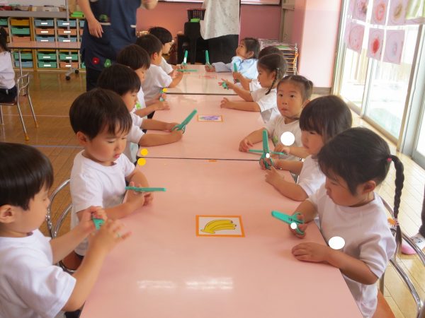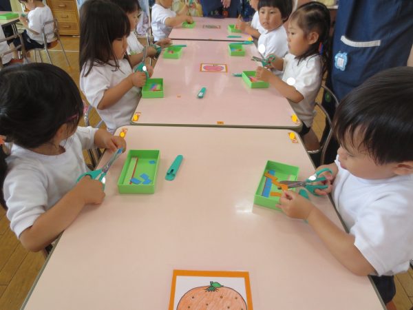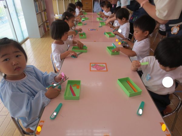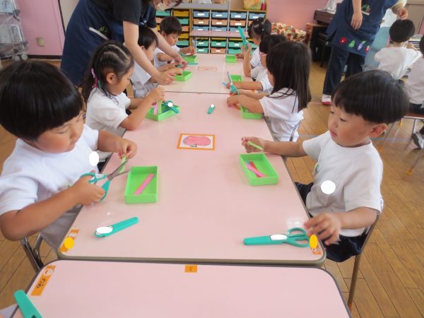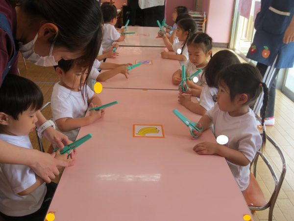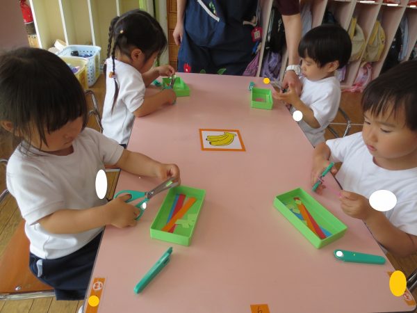 前回と同じようにハサミの持ち方・使い方を確認(手をグーパーしながらハサミを開いたり閉じたりしたよ)してから、チョキチョキと切りました。今度はアイスクリームのトッピングを切ったよ。次回はのりでアイスクリームにつけるよ。美味しいアイスクリームができるかな。