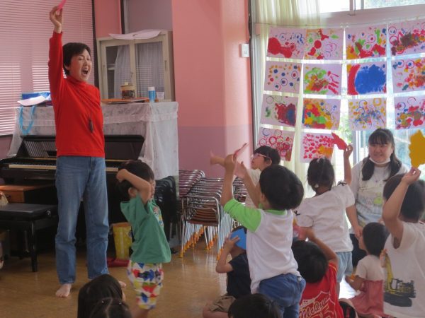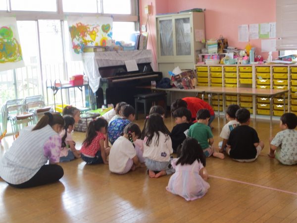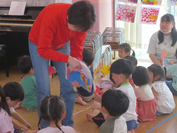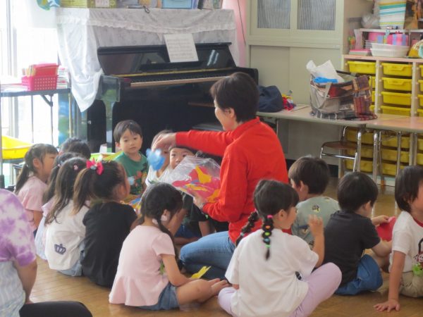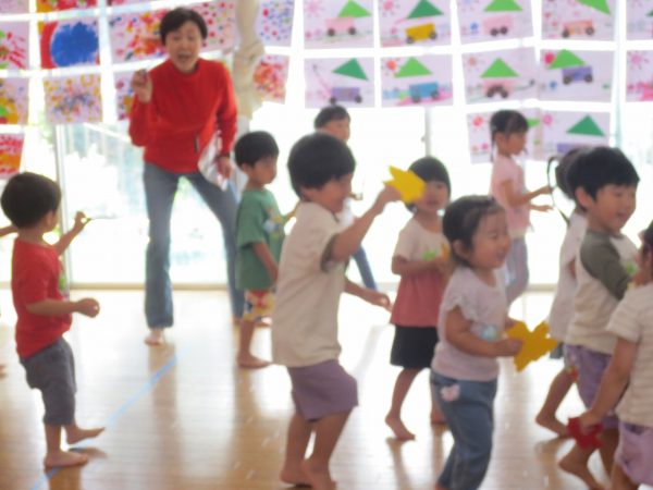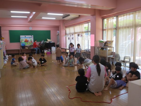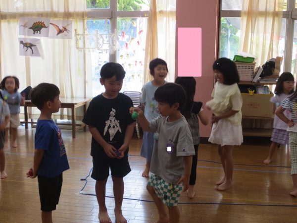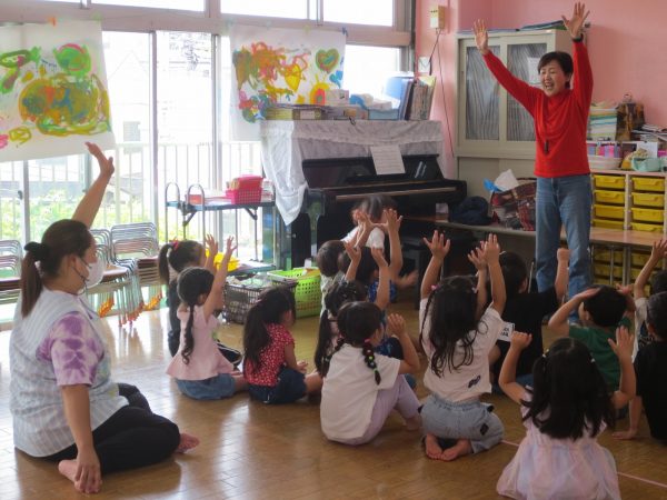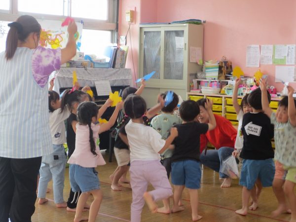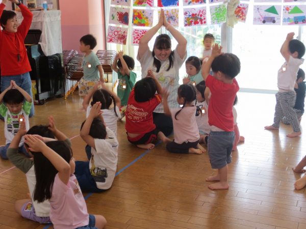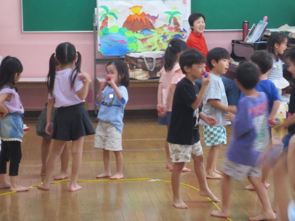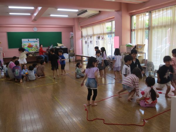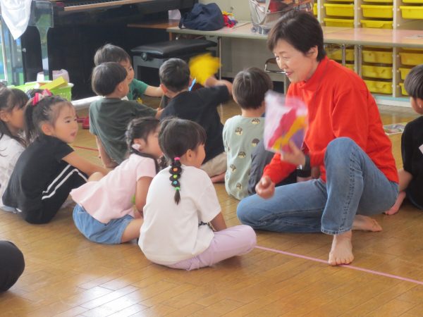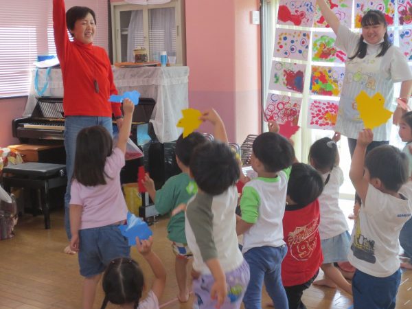 全学年でリトミックをしました。高い声(姿勢を高くする)や低い声(低くする)で挨拶をしたり、散歩の曲から音の変化でたけのこに変身したり、黄色・青・赤の小鳥から好きな色の鳥を選んで色ごとに動いたり、小鳥同士で隠れたところから「いないいないばあ!」とでてきたり、楽しい時間はあっという間に過ぎました。藤組さんはマラカスを使って、お友達同士で「いないいないばあ!」とあちらこちらからマラカスを出したり、音の調子を聞き分けて「悲しい音がしたら、家(色ロープで囲った家)に入る」ちょっと難しい内容にチャレンジしました。