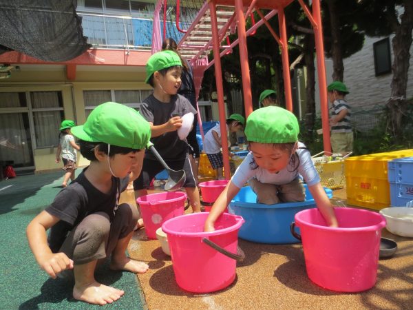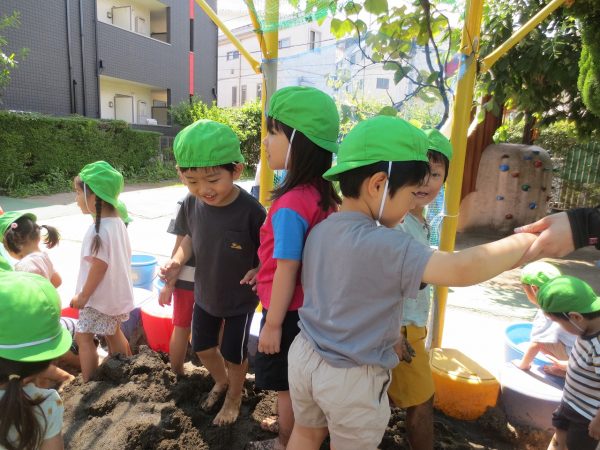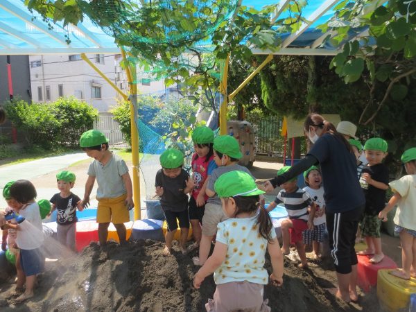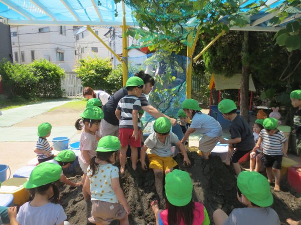 暑くなった昨日と今日で、全学年が泥遊び&水遊びができました💕 泥の感触が嫌いなお子さんもいるので、砂の感触から水を足していきながら、少しずつドロドロ感触に。また、水遊びも楽しめるように工夫しています。今日は、もっと遊びたくて小桜組さんは、なかなかお片付けができなかった位に楽しみました!!