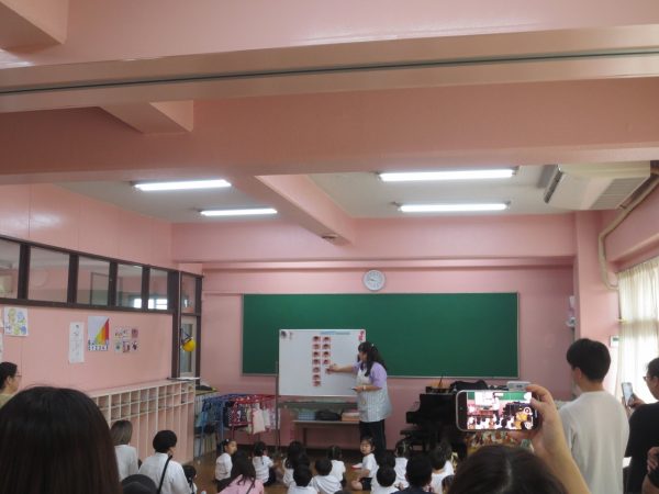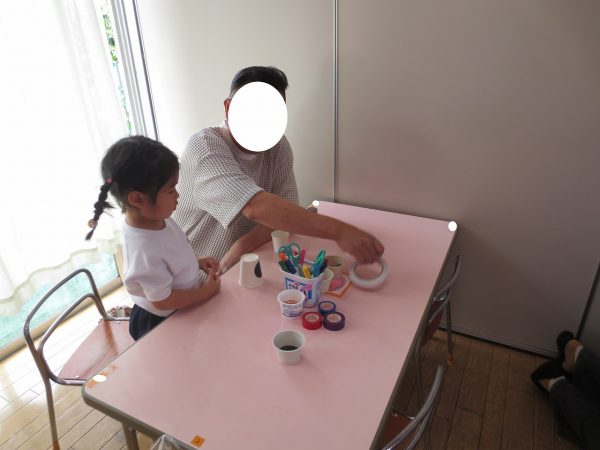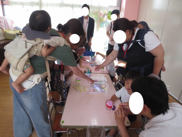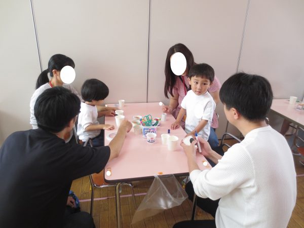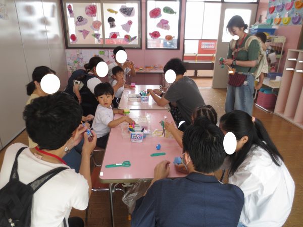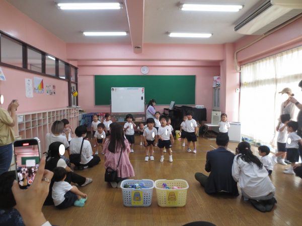 小桜組さんの土曜参観はお集まりをした後、親子で「サンサン体操」をしたり、親子で4つの手作り楽器(たいこ・ギロ・鈴・ギター)を作りました。