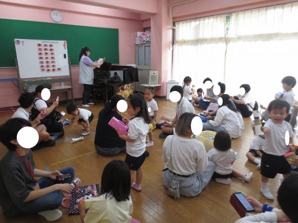 お集まりで「朝のうた」をおとうさん・おかあさんの方を向いて元気な声で歌ったの。一人ひとりの写真カードでお名前呼びをしたよ。