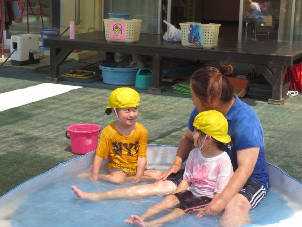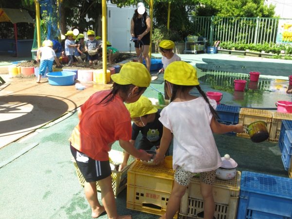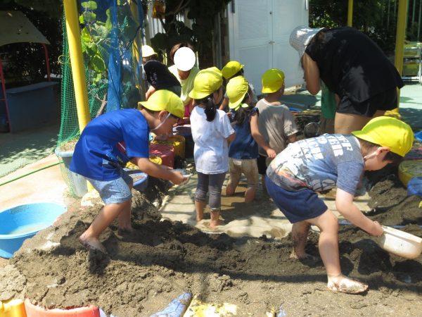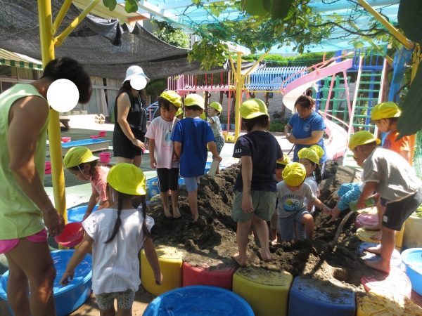 泥んこ遊びに保育参加でおとうさん・おかあさんがお手伝いにきてくれました。ドロドロのどろんこを味わってから水遊びに移る子もいれば、ずっとドロドロを楽しむ姿もみられました。 菊組さんのシャワーをしたり、汚れた洋服を洗ったり、お手伝いありがとうございました💕