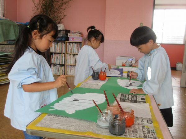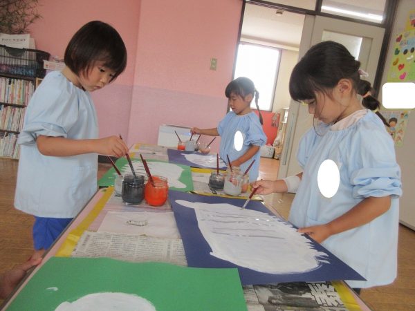 菊組さんのお部屋には、☂でも楽しいがいっぱい💕かいこが大きくなって絵の具で絵を描いたり、巧技台で遊んだよ。