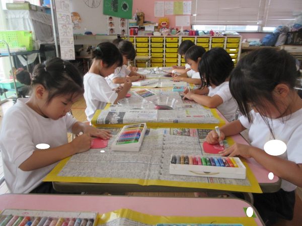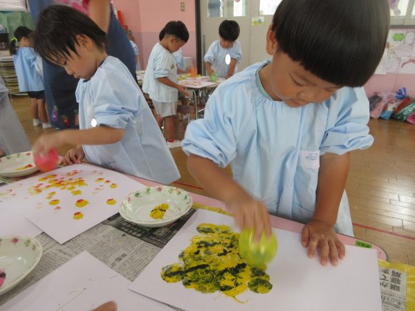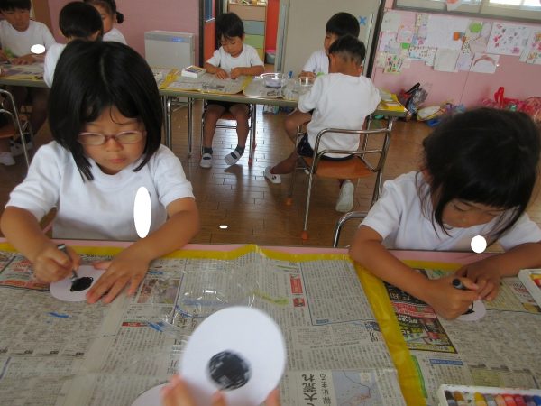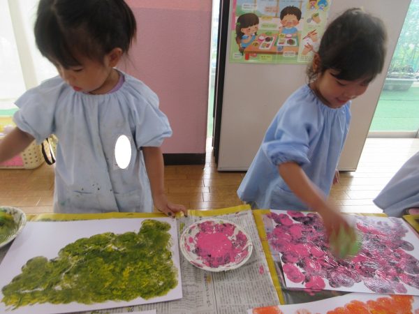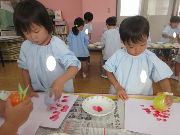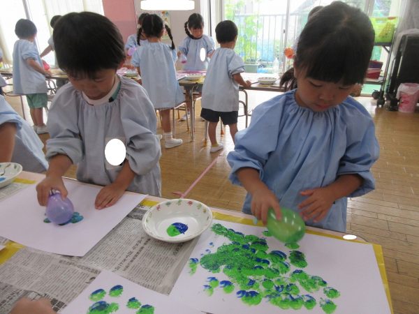 菊組さんの絵の具遊びは風船を使ってのスタンピングです。普通の絵の具ではない!絵の具を使ってポニン♩ポニン♩ポニン♩風船の感覚も面白く、楽しいスタンピングになりました💕目を描いて、口も描いて、口の中の歯は何やら牙?何ができるのかな? 菊組さんも縁日の景品づくりをしています。