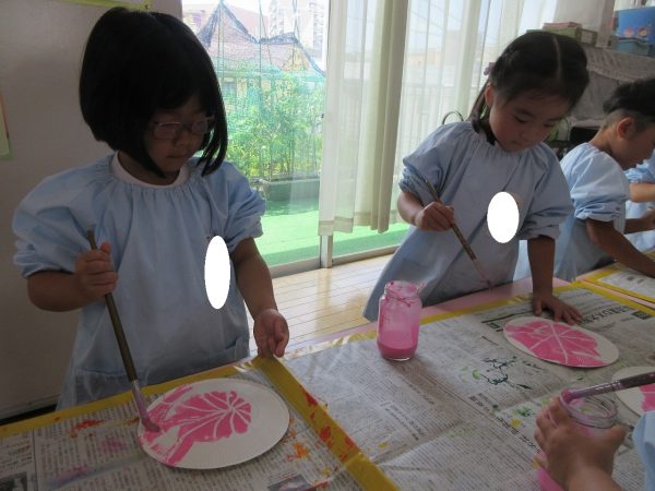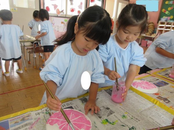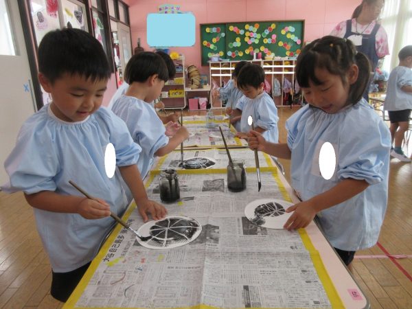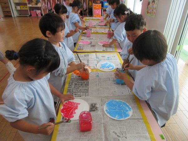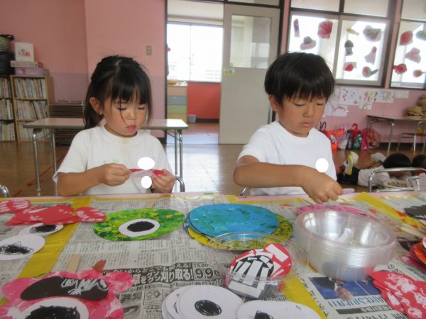 縁日のうちわに目と口がつきました。オバケはオバケだけどモンスターだよ。おもしろい顔になったね☆彡 さて紙皿に筋がついて絵の具をぬりました。何になるのかな?