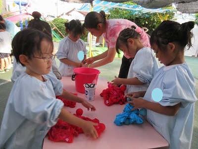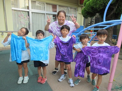 7月18日(金)から19日(土)にお泊まり会がありました。「染めTシャツつくり」は、コロナ禍でお泊まり会ができなかった頃のスペシャル企画だったのですが、小学校へ行ってからも記念の染めTシャツになり、お泊まりが再開できるようになった今もご家庭でゴム結わきのご協力をいただきながら大事な活動になっています。今年もありがとうございました💕