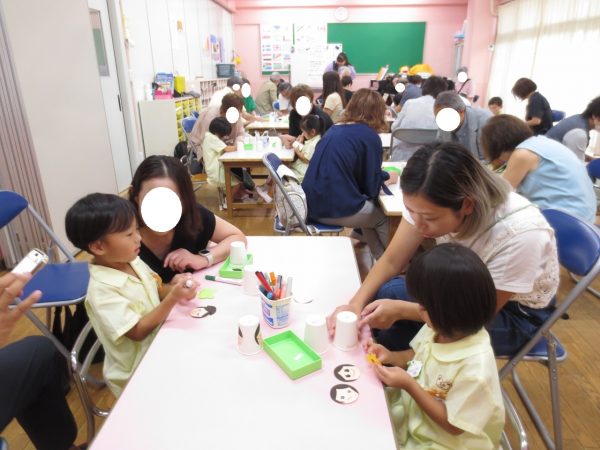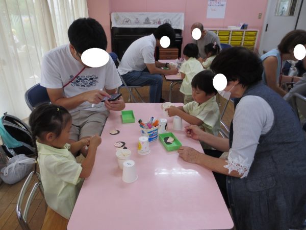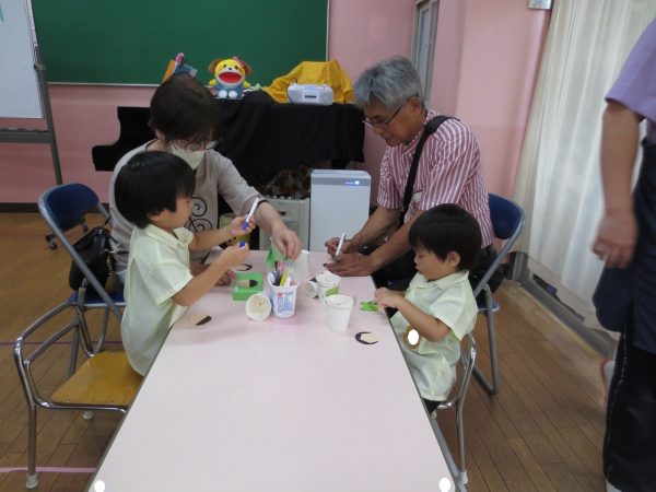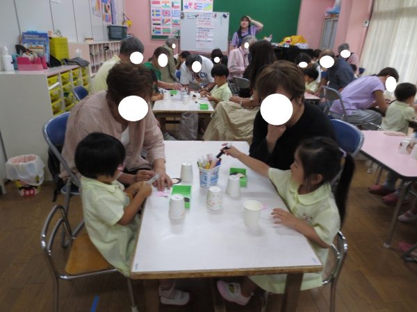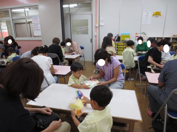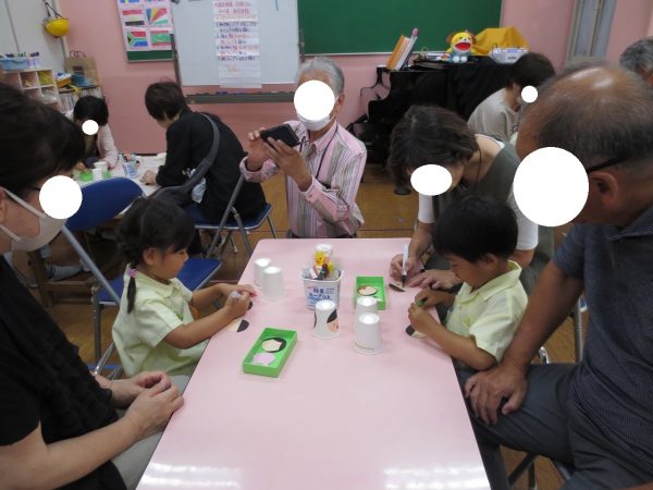 小桜組さんのつくって遊ぼうは「紙コップロケット」です。紙コップに動物さんや小桜組さんのお顔を描いて貼りました。できたら、早速跳ばしてみるとポンと高く跳んだ時の小桜組さんの笑顔はとびきりでした。お家でもおとうさん・おかあさんと一緒に跳ばしてみてね。プレゼントは小桜組さんが作った可愛い写真立てです。撮った写真を飾ってね。