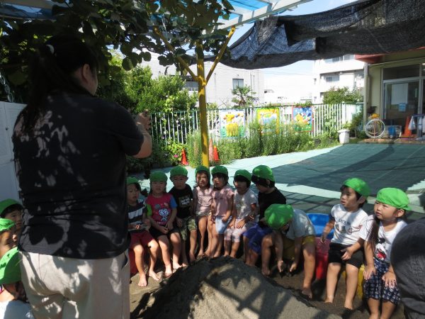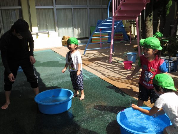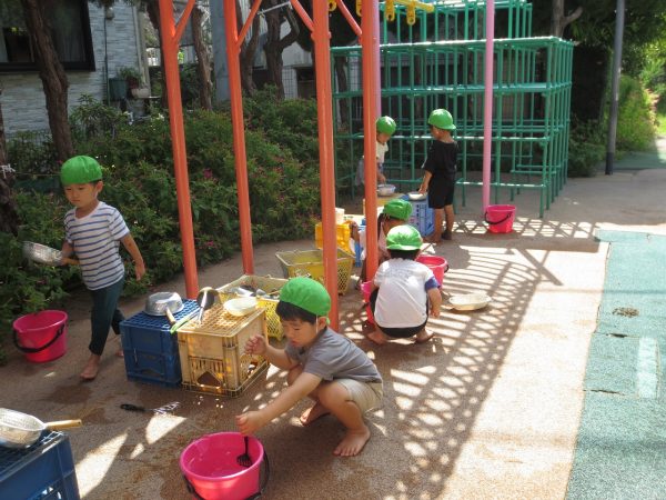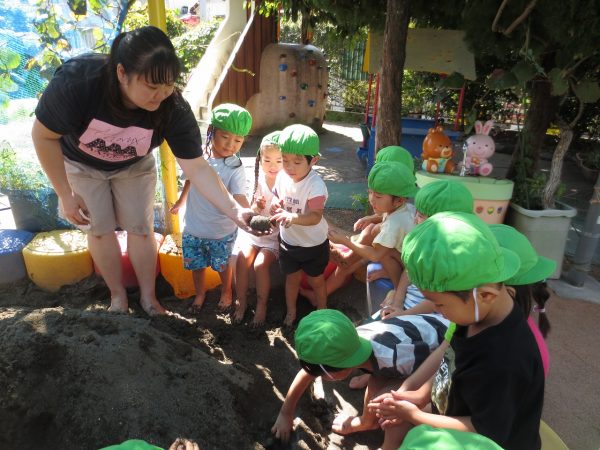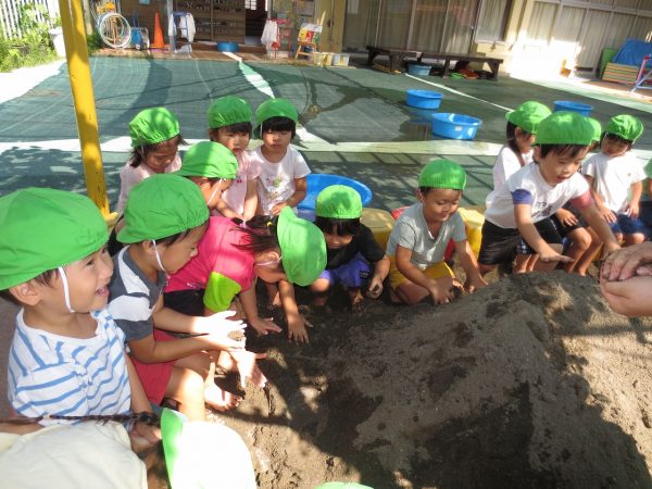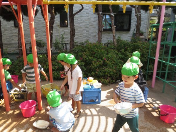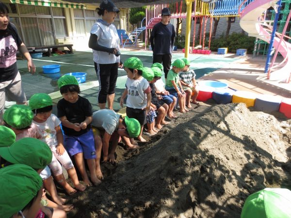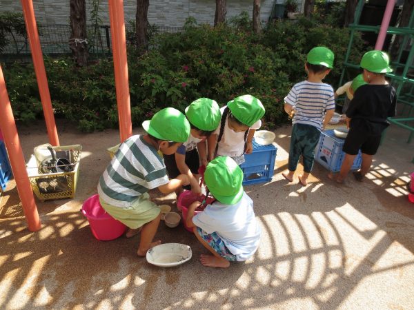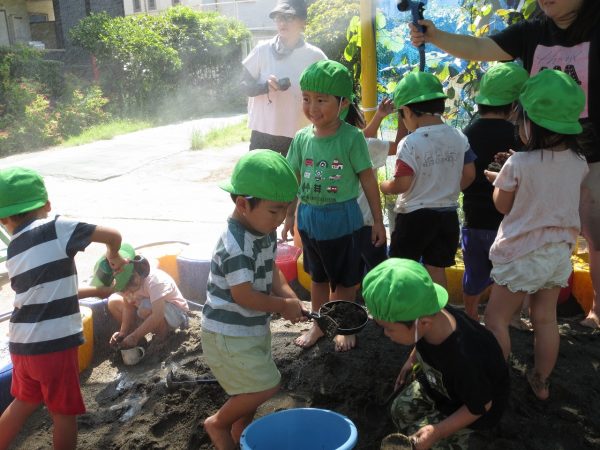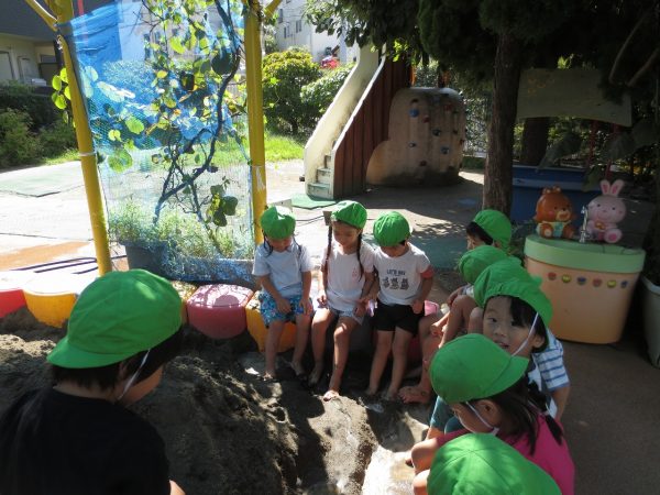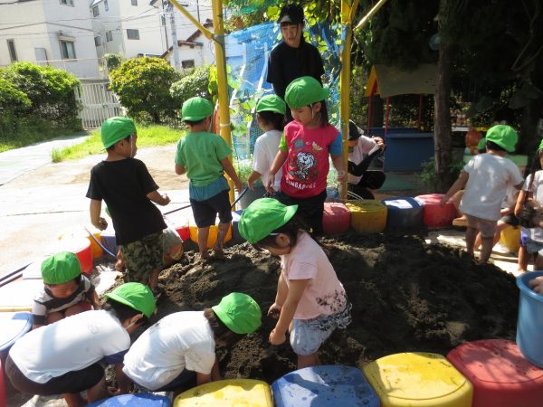 平均気温が2度も高くなった今夏は、晴れている日はプール遊びをしました💕 泥んこ遊びも2学期に予定していた小桜組さん。 砂場に掘った足場の中に足を入れて、砂のサラサラからお水をかけてドロドロに変わる感触を楽しんだ後、お山を崩したり、今夏最後のドロドロを楽しみました。お水のかけっこやお水のお料理も楽しかったね💕