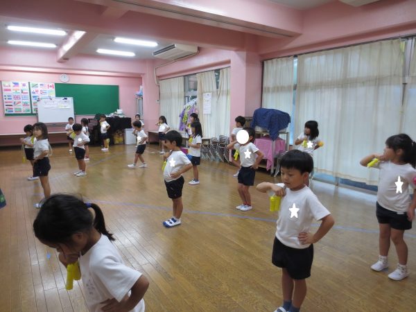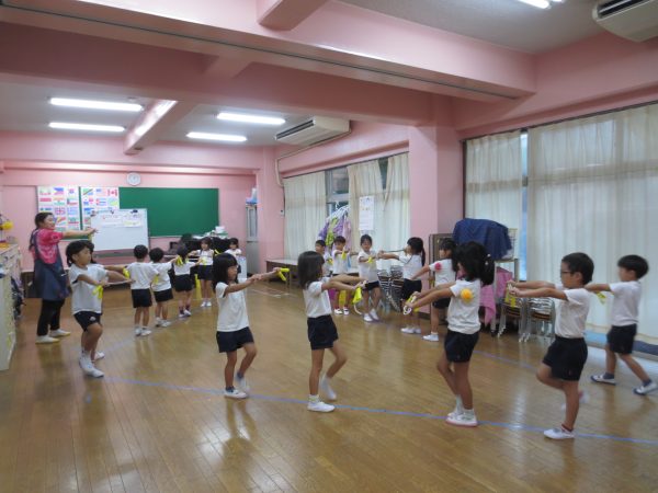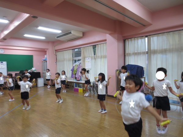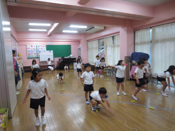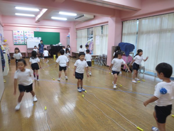 1学期から少しずつ「なわとび体操」の前半まで練習していました。夏休みが終わり2学期に入って前半を忘れたかなと心配もしましたが、みんなよく覚えていて、後半の練習も始まりました。3つのグループに分かれての隊形移動やグループのお友達との動きも出てきます。藤組さん、ガンバレ~