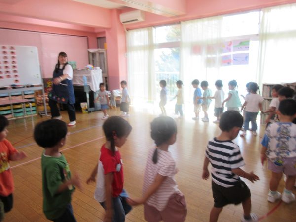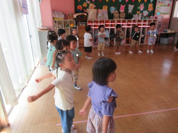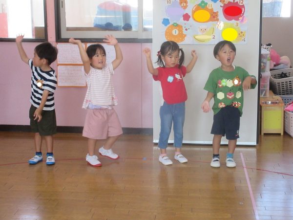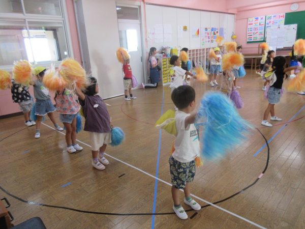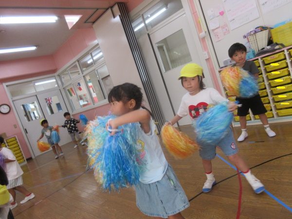 お部屋でお遊戯の練習をしている菊組さんと小桜組さん。 ステキなポンポンと元気がわいてくる曲「ばりばりばりはっぴー😊」にのって可愛く・カッコよく踊っている菊組さん。 小桜組さんは、しまじろうの親しみのある曲にのって、どんな姿も可愛く踊っています。