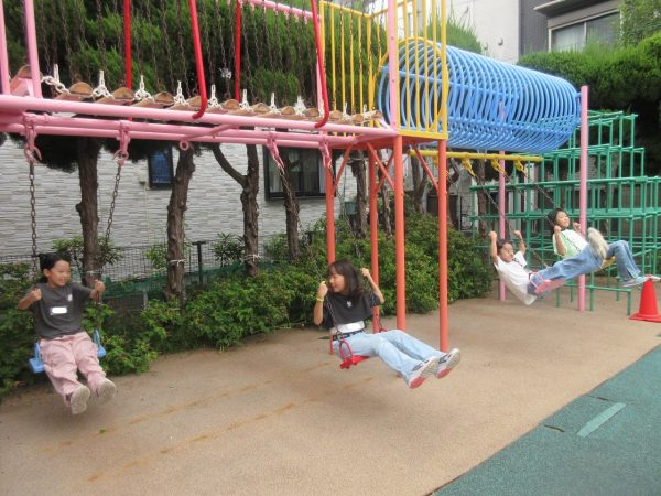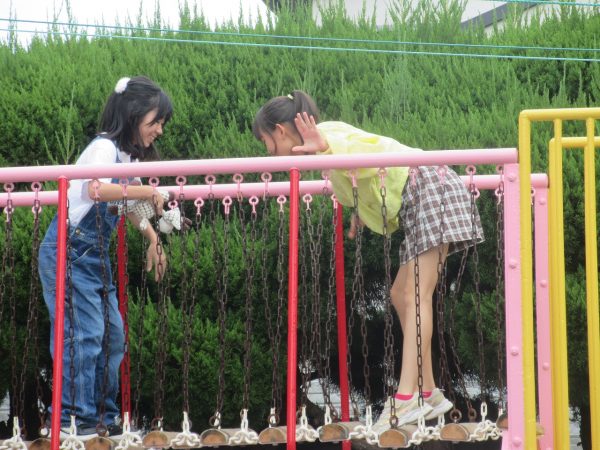 <4年生以上> 懐かしのゆらゆら橋。ブランコは小さくて…。ブランコの棒には飛び上がってつかめるよ。バレーボールに挑戦したよ!! また、来年遊びに来てね。バレーボール練習しておいてね💕