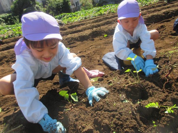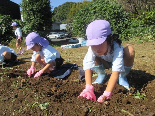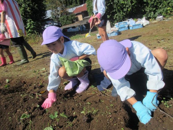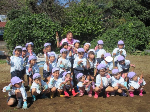 藤組さん、みんなでお芋ほりに行ってきたよ。前日の雨模様がうそのような青空で、芋畑にはたくさんのトンボも飛んで気持ちのいいお天気になりました。お芋の不作を伝え聞いて心配だったけど、藤組さんのお芋袋にはたくさんのお芋が顔を出していたよ。今日はお芋のお味噌汁かな。大学芋かな。さつまいものフライかな。