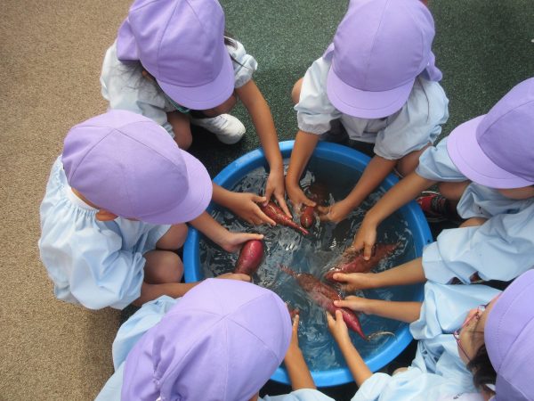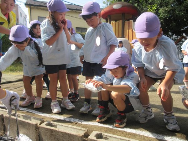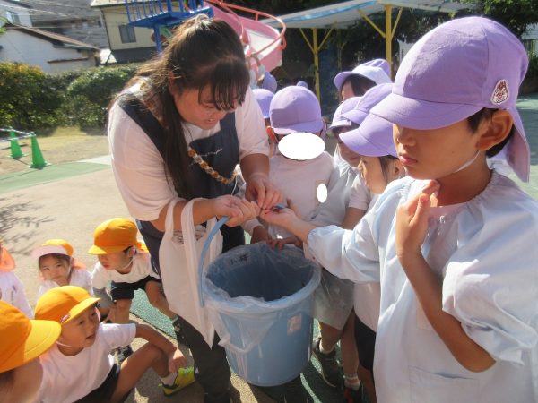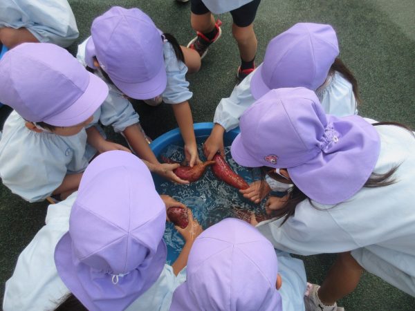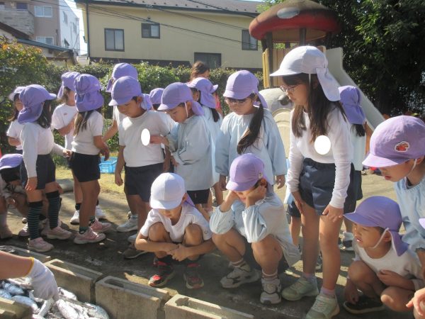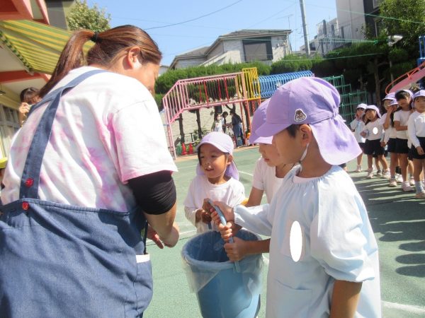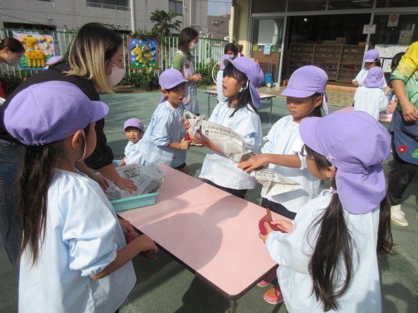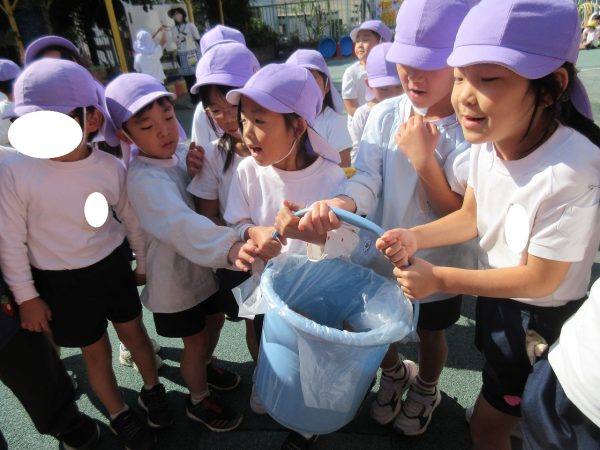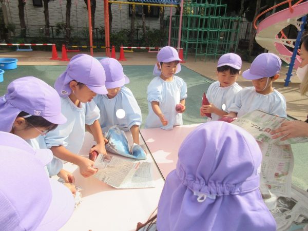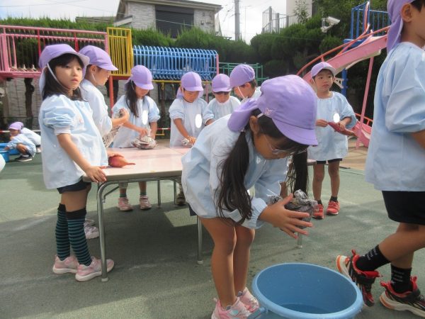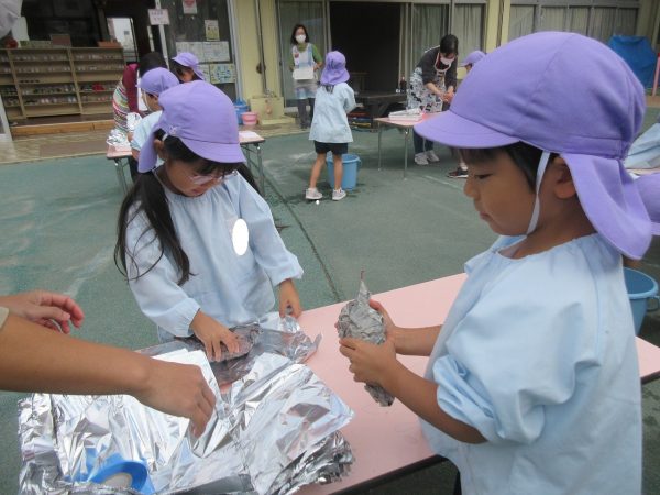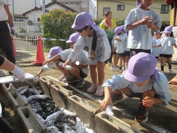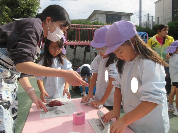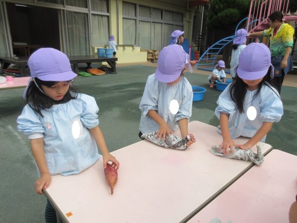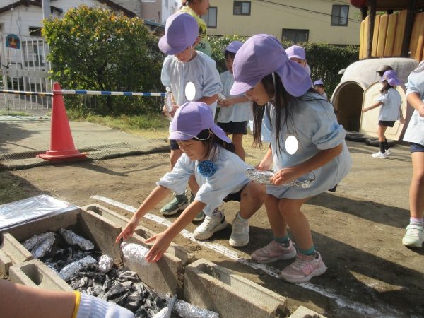 お芋ほり遠足に行って、焼き芋をするために菊組さんにも小桜組さんにも、たくさんお芋を掘ってきてくれた藤組さん!!お天気にも恵まれて秋晴れの下、焼き芋をつくってくれました。泥を洗って、新聞紙を巻いて、水をつけて、アルミホイルを巻いて、炭火の中に入れました。