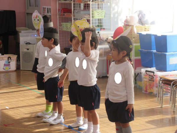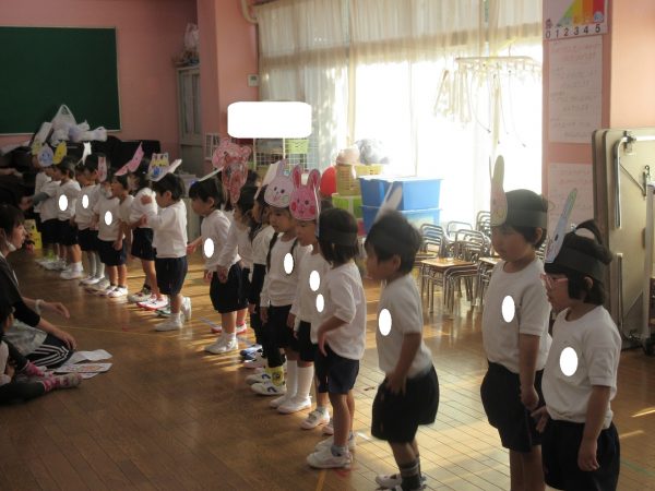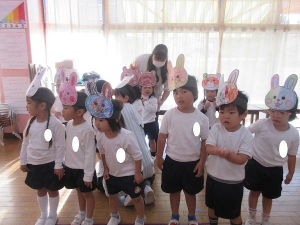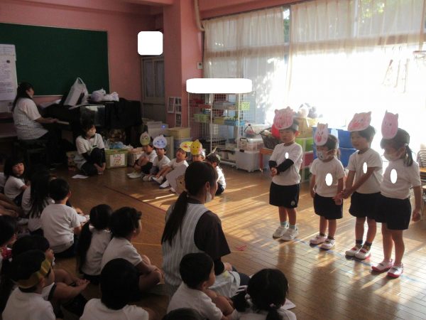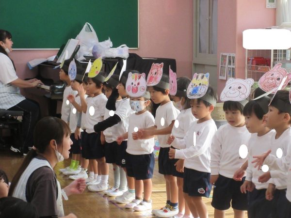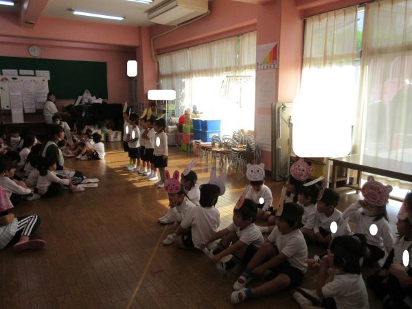 最初に登場したのは「こりすさん」上手にバイオリンがひけたかな?次に登場したのは「うさぎさん」上手にピアノがひけたかな?3番目に登場したのは「ことりさん」上手にフルートがふけたかな?最後に登場したのは「たぬきさん」上手に太鼓をたたけたかな?最後は山の仲間で一緒に演奏をします。お辞儀も可愛らしい小桜組さんでした。