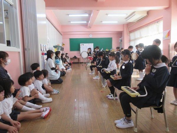 藤組さんの合奏と歌「あおいそらにえをかこう」を真剣に見ている小桜組。藤組さん、見せてくれてありがとう💕