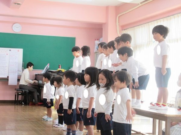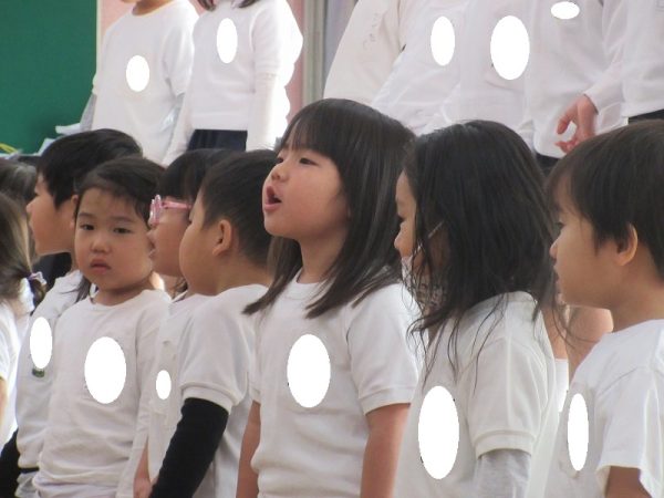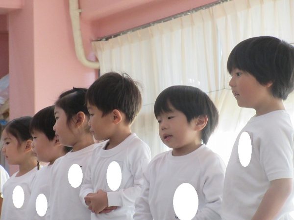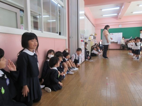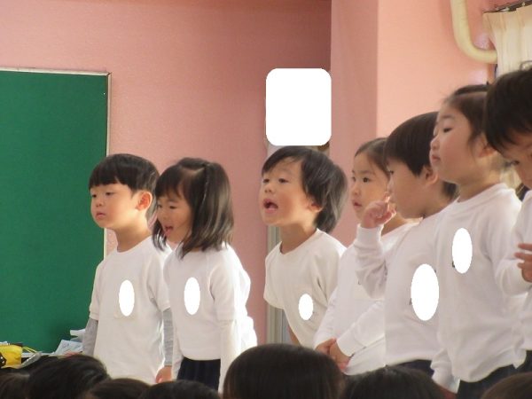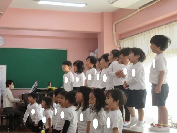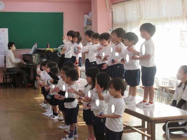 小桜組さんはお遊戯会で「線路はつづくよ どこまでも」をします。すずとカスタネットに分かれて楽器をならします。藤組さんと合奏と歌の見せ合いっこをして、本番と同じように段に上りました。