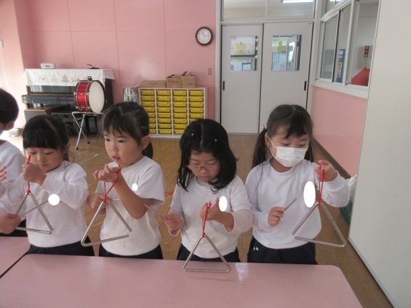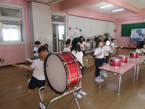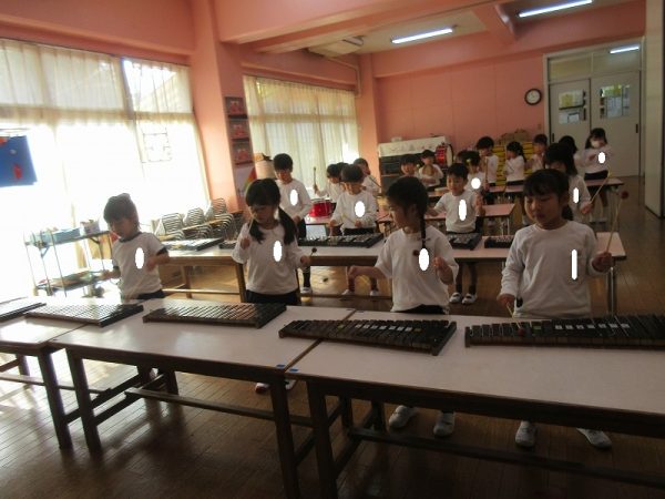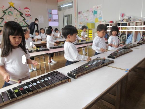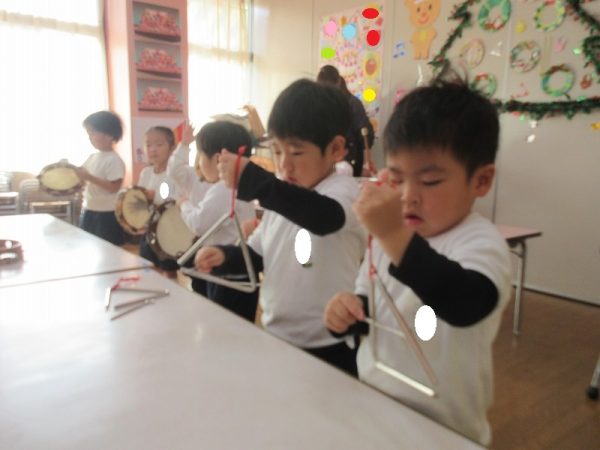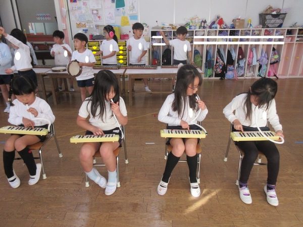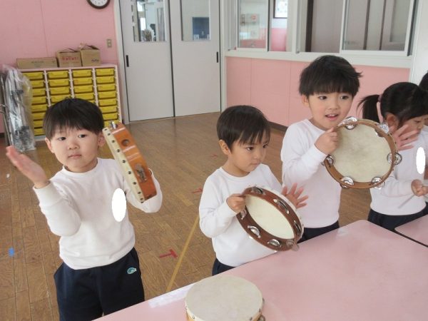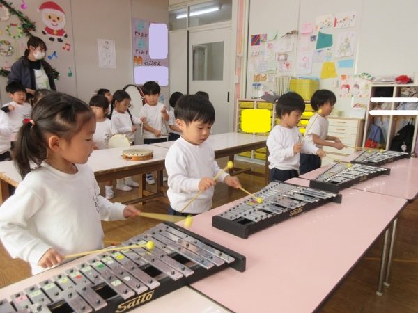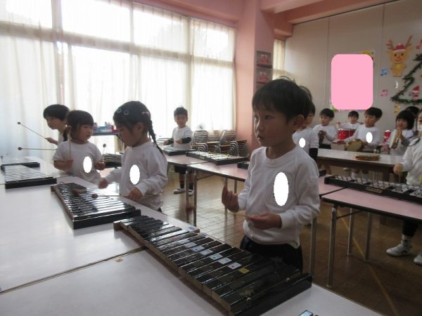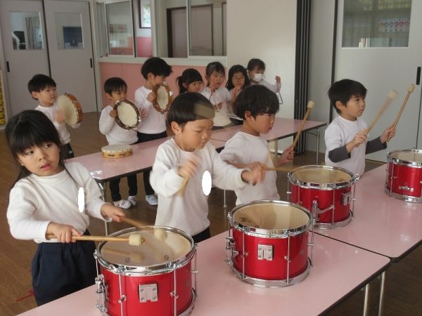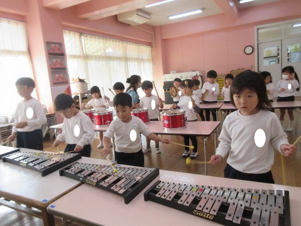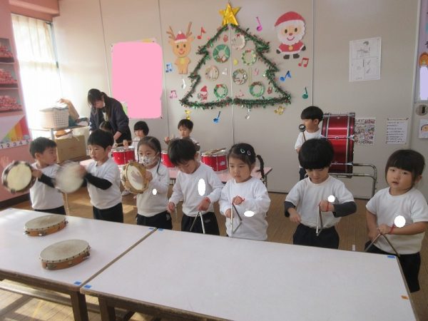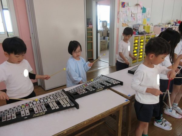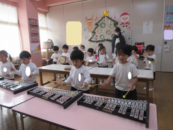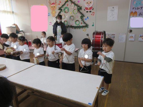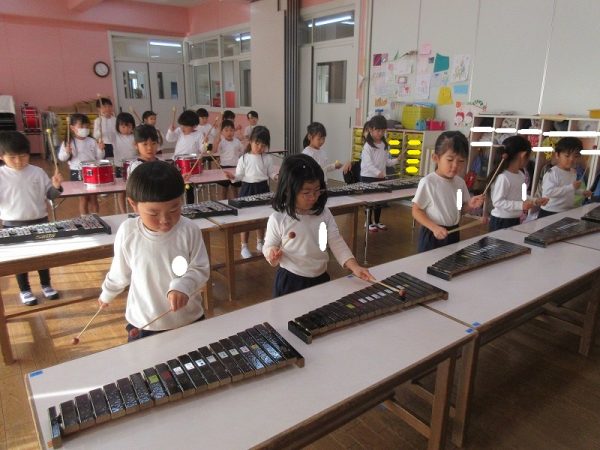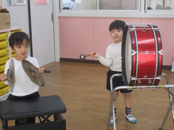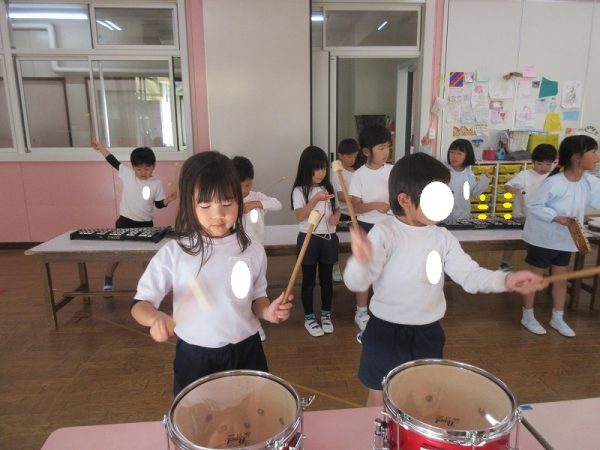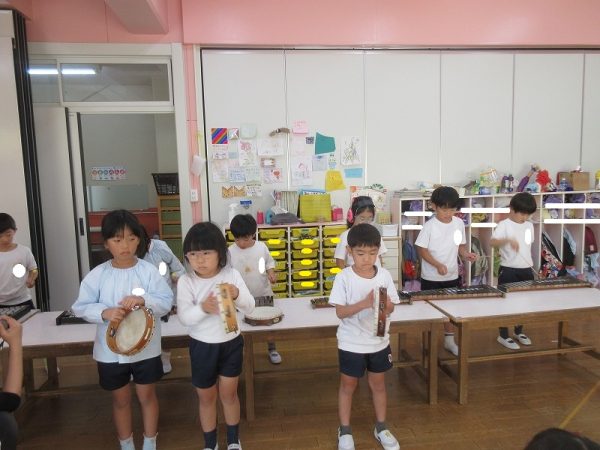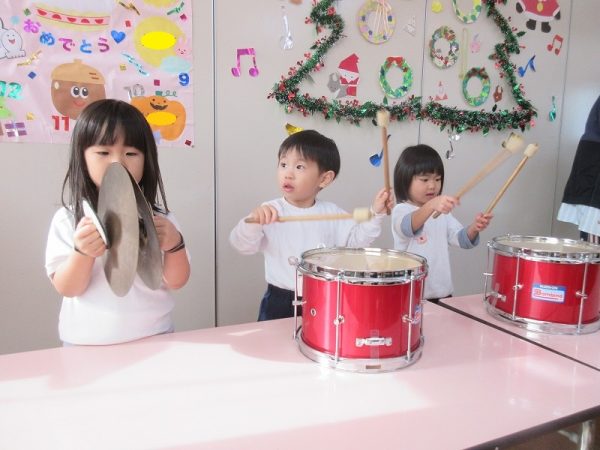 お遊戯会で藤組さんがピアニカ・シンバル・大太鼓・小太鼓・鉄筋・木琴・タンバリン・トライアングルを使って合奏をしました。菊組さんも小桜組さんも楽器をかりて、藤組さんは楽器を交代して、順番に回りながら好きに音を出して合奏をしました。いろいろな音を楽しめて面白かったね☆彡 ≪菊組≫ ≪小桜組≫ ≪藤組≫