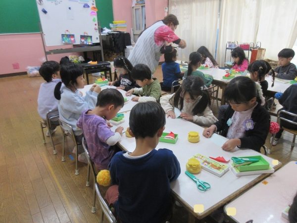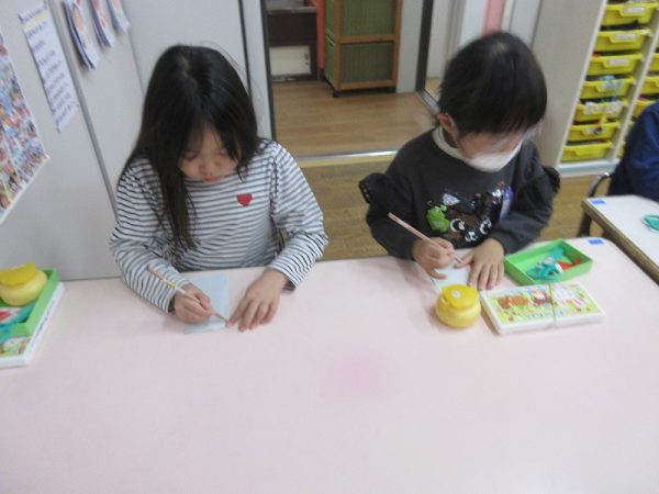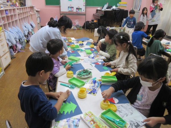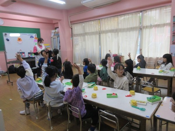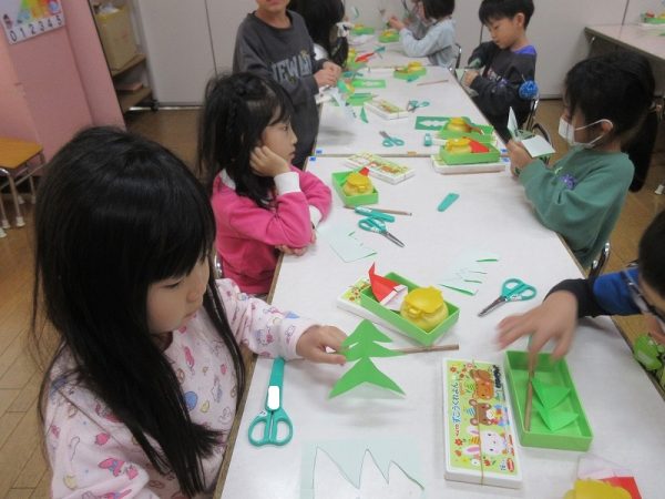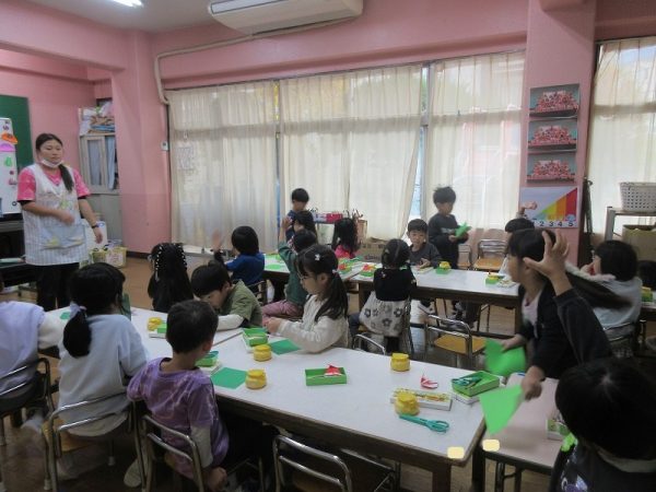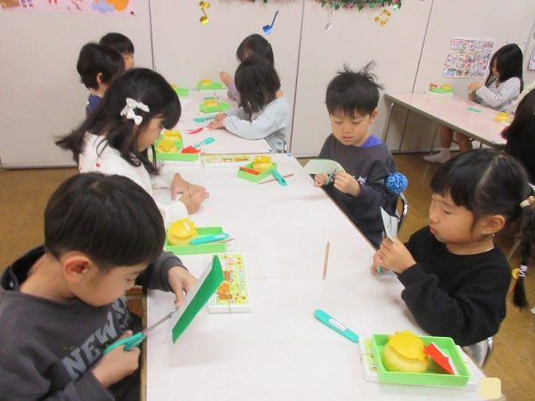藤組さんにはお当番さんがいます。今日は折り紙(黄緑・緑)を配ってくれました。しっかり手をあげていてね。