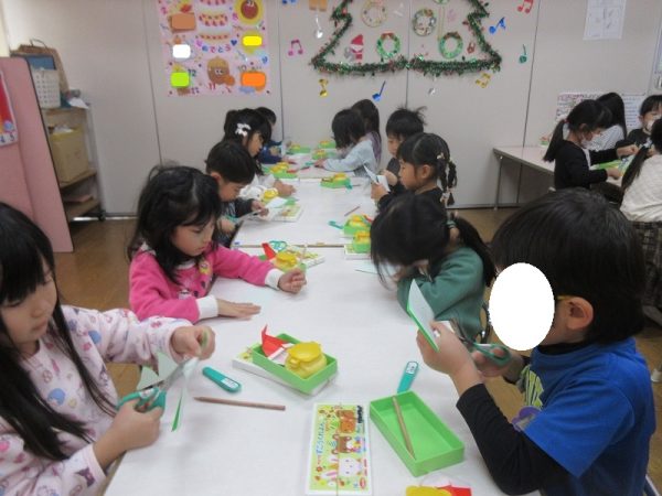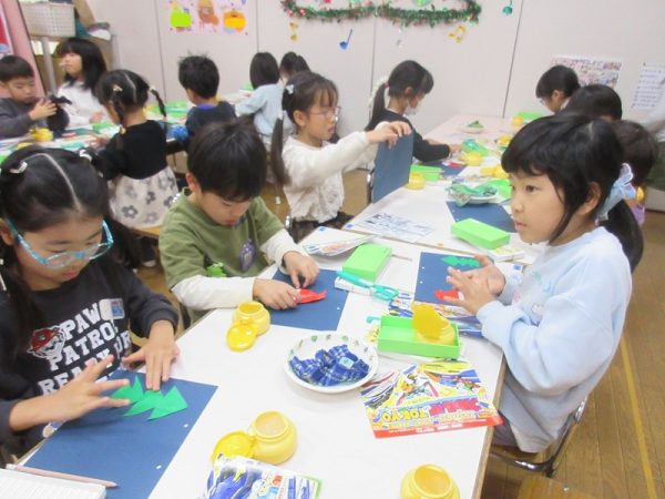 藤組さんのクリスマス飾りは折り紙を使って、折ったり、切ったり、オリジナリティーいっぱいの作品になりました🔔片方だけ切ったのに木になっていたり、°˖✧◝(⁰▿⁰)◜✧˖°キラキラ折り紙も使って自分で飾りを考えて、鉛筆で飾りを描いて切って木に貼って一人ひとり夢中になって作りました。