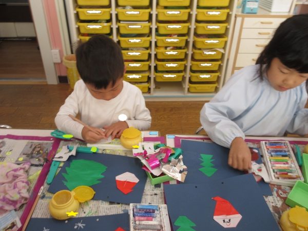 折り紙で折ったサンタさんと切ったツリーを貼りました。