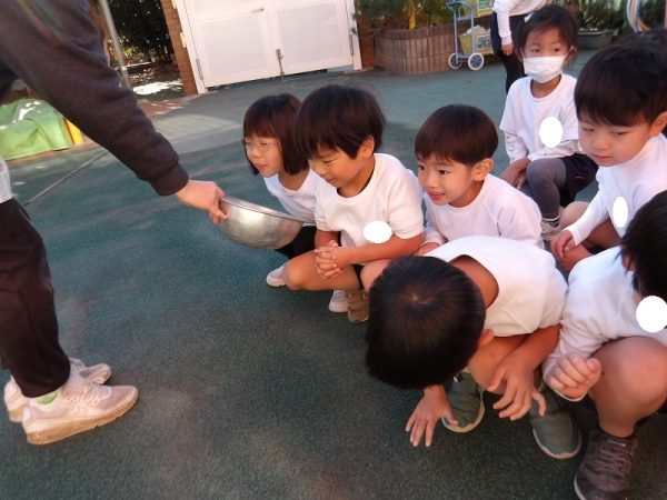 もち米や蒸したもち米を見て・においをかいで、ついて・ついて・みんなでついて、「どんなになったかな」と一人ひとりさわってみました。当園のおもちつきは食べるお餅つきではなく、お餅ってこんな風にできているんだよーとその経過を見て・臭いで・さわって味わうお餅つきです。まだまだ粒粒は残っていますが鏡餅も作りました。