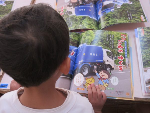 ≪藤組≫ 町を綺麗にしてくれるゴミ収集車でゴミの行方を追いながら「ゴミの分別」の仕方にふれたり、ごみを減らす方法を考えたり、「紙とあそぼう」では紙のばねの折り方や紙がのびる切り方、紙のすごさを紹介していました。