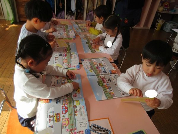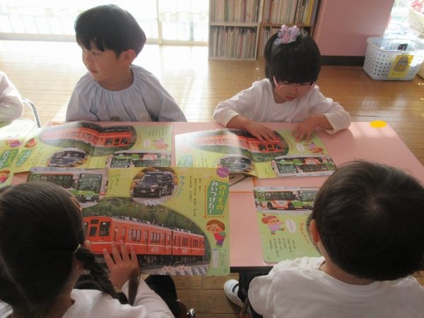 ≪小桜組≫ 電車・バス・飛行機・大型客船の乗り物をみんなで見ました。最近、西横浜駅に電車を見に行ったばかりの小桜組さん、乗り物シールを喜んで貼りました。