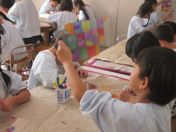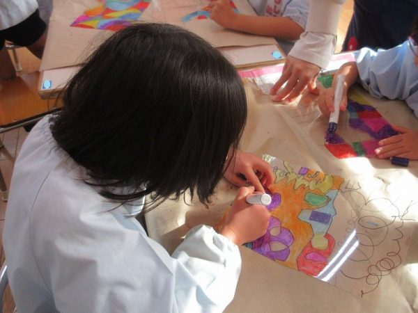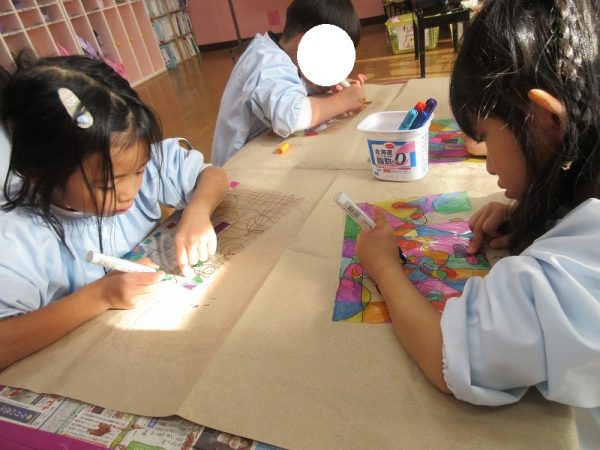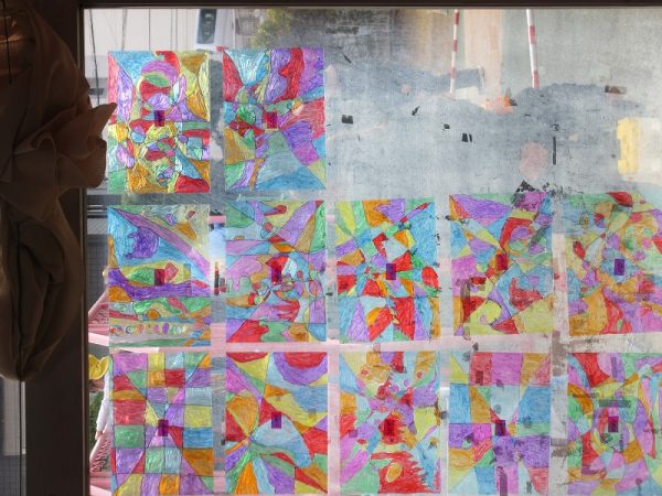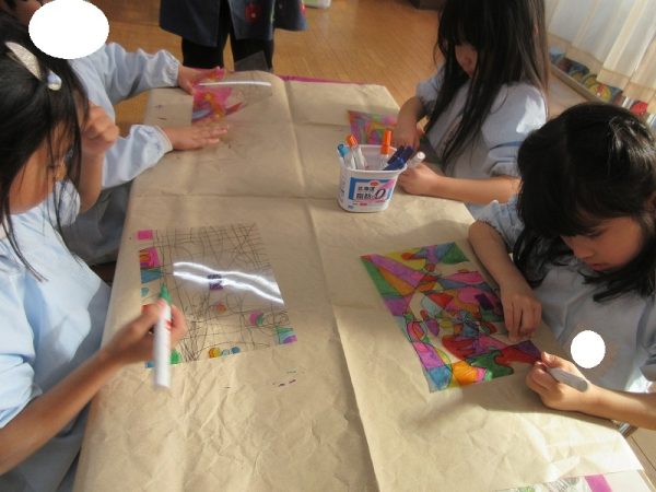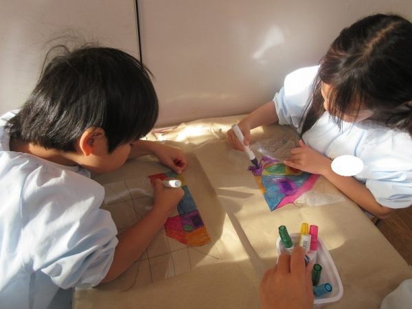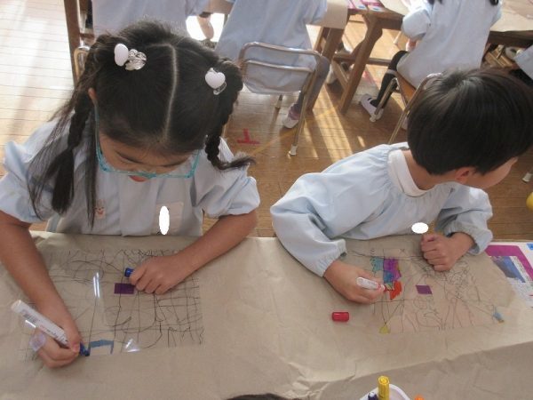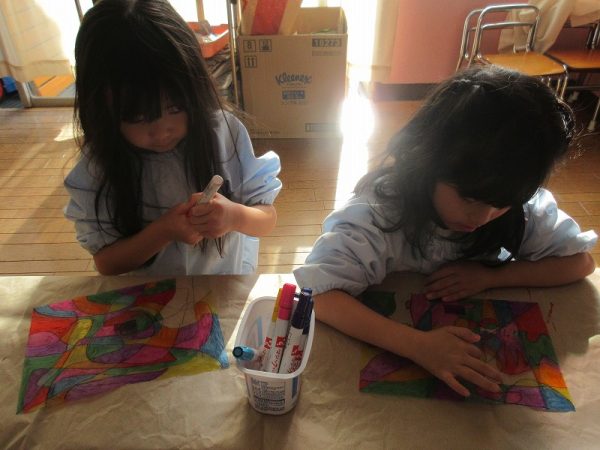 年長組さんでは今までにない素材を使って描画活動をしますが、プラスチックボードと油性ペンを使って、思い思いの線を描き、その中に色を塗りこみながらステンドグラスをつくりました。形の中を周りの色と同じにならないように何色にするか考え考え、また雑にならないように塗り込んでいる姿は真剣そのもの。空間や壁にかざしながら色と光を楽しんでいました。ステンドグラスが集まっていくと窓がステキになりました。作品展で飾りますのでお楽しみに☆彡
