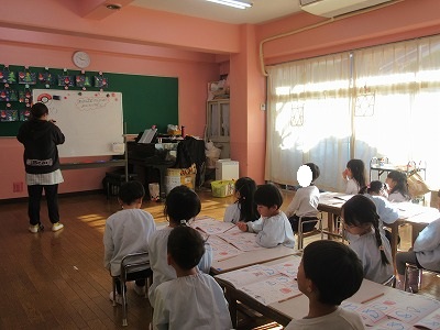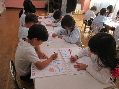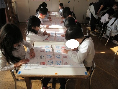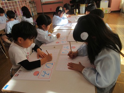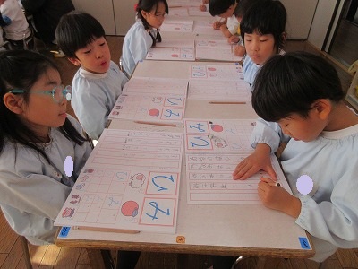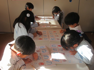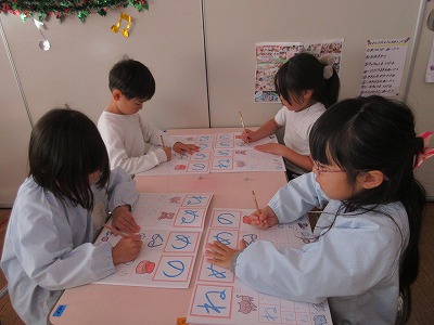 卒園アルバムの表紙絵を丁寧に描いたり、来年の作品展の共同製作をするお話を決めたり、時間をかけて取り組むものも増えている藤組さん。今年最後のひらがなワークをしました。いろいろな姿勢をとりながら各々に書いている姿にもうすぐ小学生になる姿が重なります。