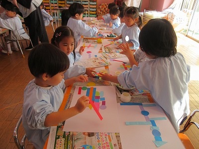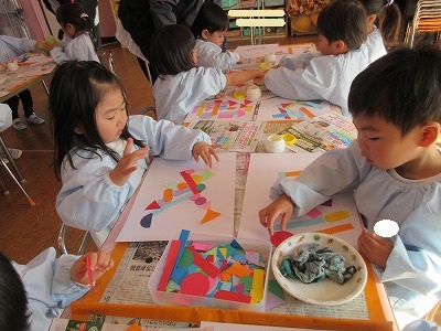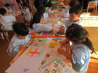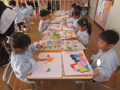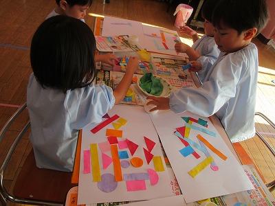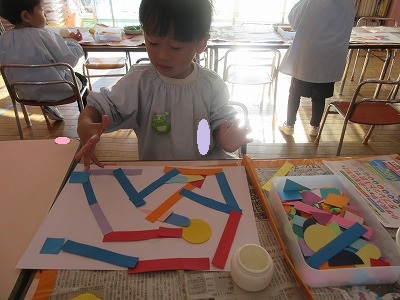 ▢▽〇、小さい▢▽〇、大きい▢▽〇、長い▢、色々な色の紙をつなげてつなげて構成遊びをしました。電車をイメージしたり、道路をイメージして車が登場してきたり、ただただつなげていくことに没頭したり、一人ひとり個性いっぱいの作品ができました。作品展で飾りますのでお楽しみに💕