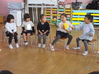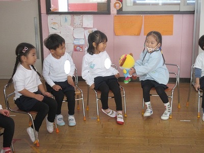 爆弾ゲーム:名前は怖いけどお人形を音楽に合わせて渡して、音楽が止まった時にお人形を持っていたら鬼だよ。